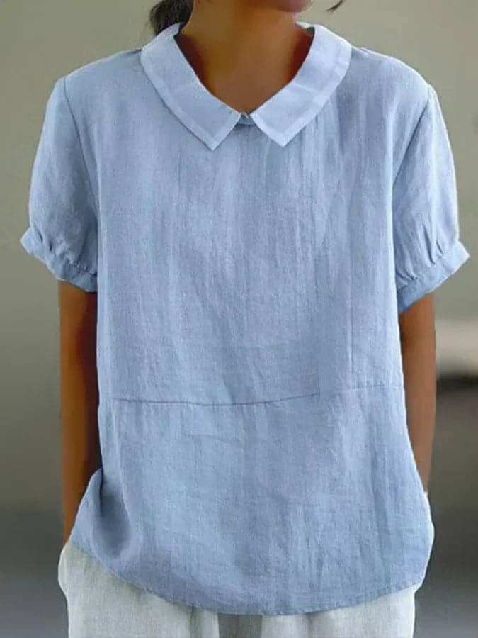Gefertigt aus hochwertigem, atmungsaktivem Leinenstoff, bietet diese Bluse eine entspannte Passform, die sicherstellt, dass Sie kühl und bequem bleiben, egal wohin Ihr Tag Sie führt. Sie verfügt über einen kontrastierenden weißen Peter-Pan-Kragen, der dem minimalistischen Design einen klassischen und verspielten Akzent verleiht.