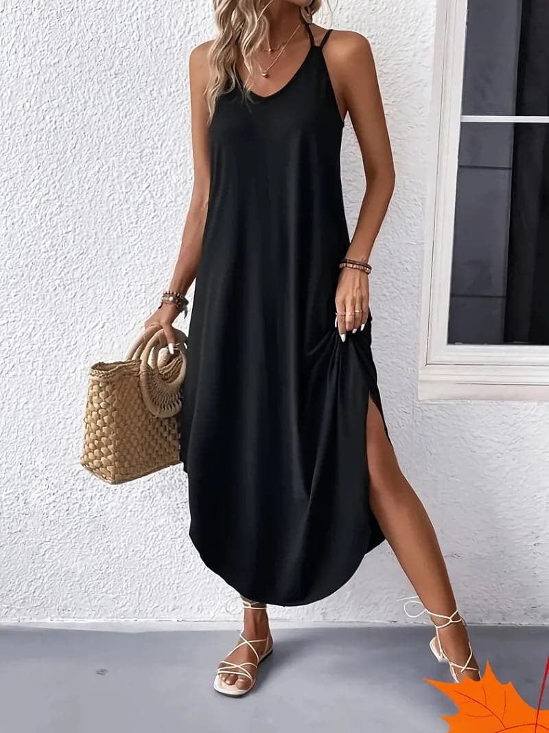 Erhöhen Sie Ihre Garderobe mit unserem zeitlos eleganten Maxikleid, einem vielseitigen Stück, das Einfachheit und Raffinesse ausstrahlt. Gefertigt aus einem luxuriös weichen und fließenden Stoff, bietet dieses Kleid einen schmeichelhaften ärmellosen Schnitt und einen verführerischen V-Ausschnitt, der Ihre natürliche Anziehungskraft unterstreicht.