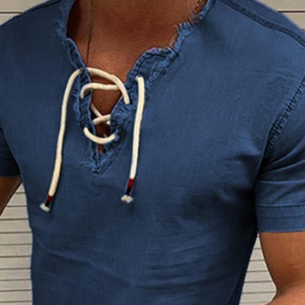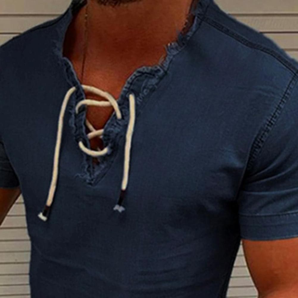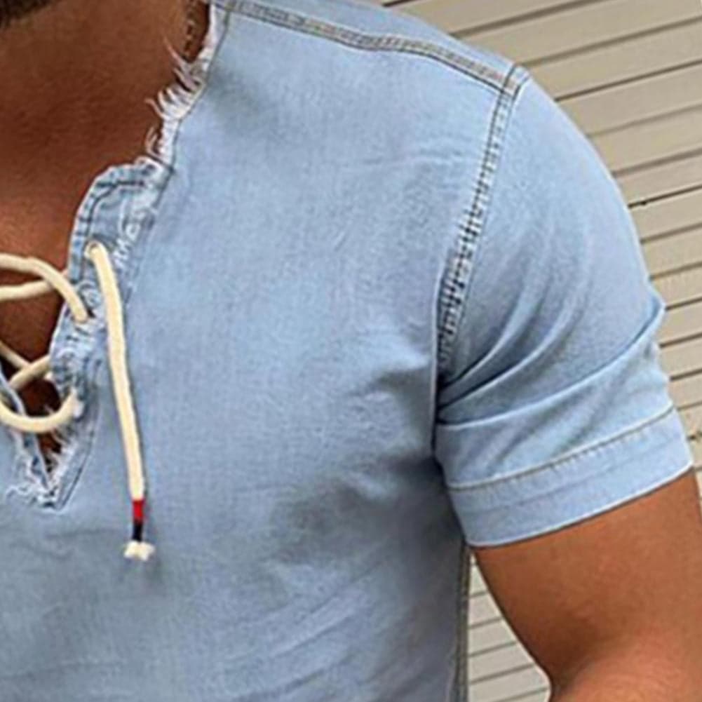 Verleihen Sie Ihrem Alltagslook mit unserem Vintage Lace-up V-Ausschnitt T-Shirt eine mühelose Stilnote. Dieses einzigartige Oberteil verbindet lässigen Komfort mit einem Hauch von robustem Charme und besticht durch sein wettergegerbtes, denim-inspiriertes Design, das garantiert Blicke auf sich zieht.
