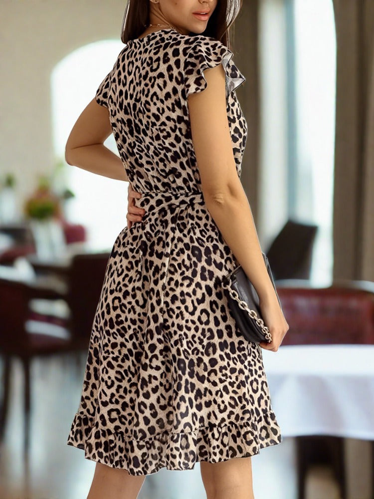 Entfesseln Sie Ihre wilde Seite mit diesem atemberaubenden Leopardenprint-Kleid, das mühelosen Chic verkörpert. Es verfügt über einen schmeichelhaften V-Ausschnitt und kurze Flügelärmel, die Eleganz und Verspieltheit verleihen. Mit seiner taillierten Taille, komplett mit einem Selbstbindegürtel, betont dieses Kleid Ihre Silhouette und bietet gleichzeitig Komfort und Stil.