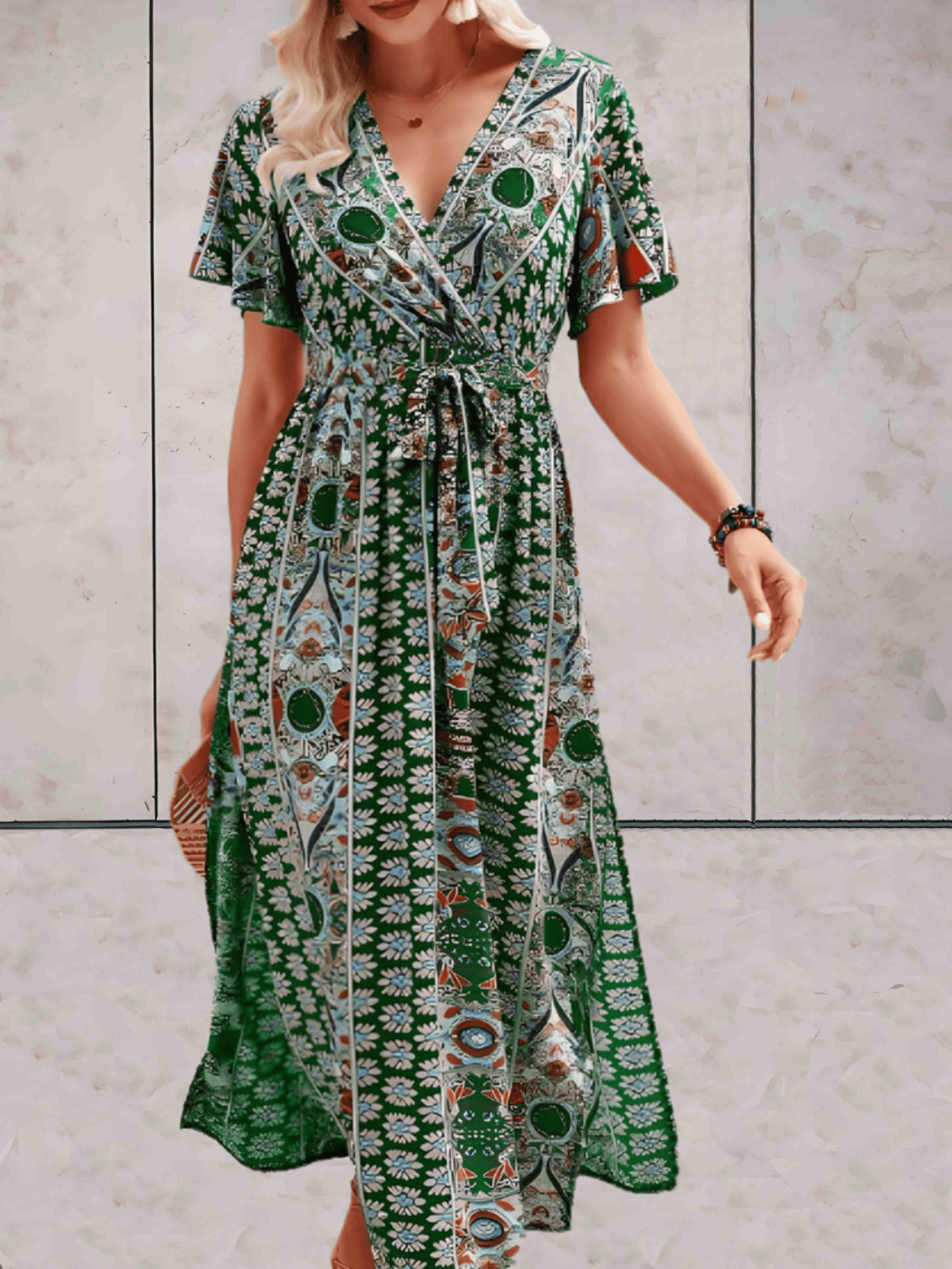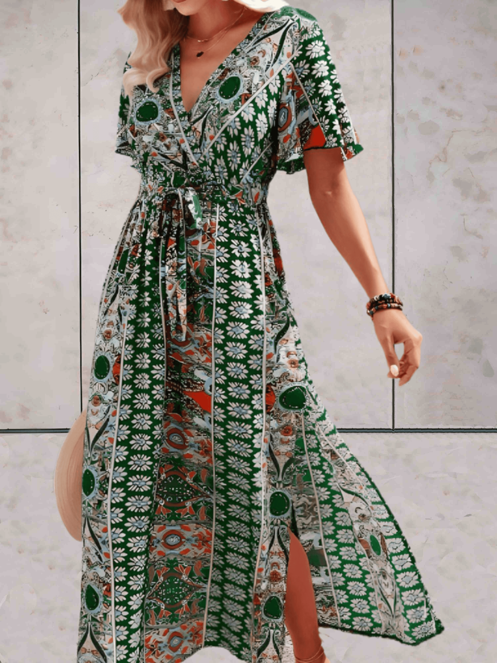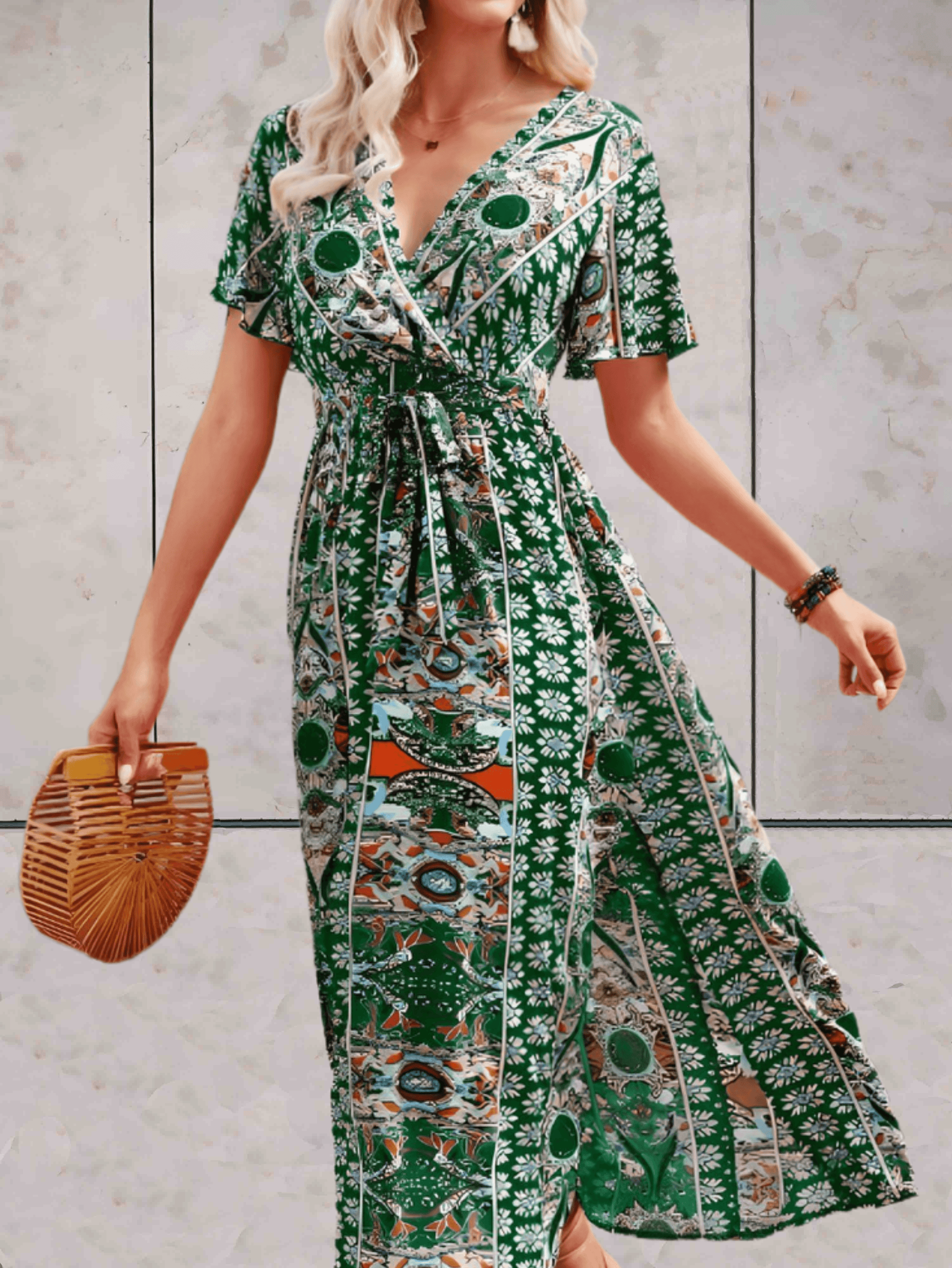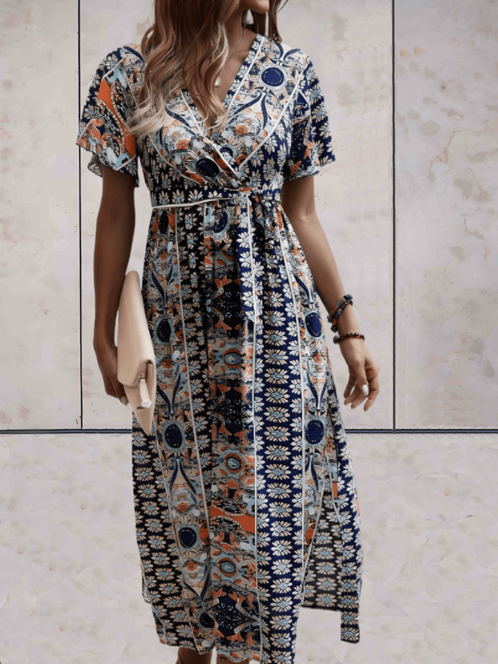 Unser charmantes Wickelkleid mit V-Ausschnitt und kurzen Ärmeln ist die perfekte Wahl für jede Gelegenheit. Das Kleid besticht durch sein einzigartiges Muster und den fließenden Schnitt, der eine elegante und feminine Silhouette kreiert. Der hohe Schlitz sorgt für eine ansprechende Note und bietet gleichzeitig Bewegungsfreiheit. Mit dem Bindegürtel können Sie die Passform individuell anpassen und Ihren Look stilvoll abrunden. Egal, ob Sie einen Tag in der Stadt verbringen oder eine Abendveranstaltung besuchen, dieses vielseitige Kleid verspricht, Sie stilvoll und komfortabel zu begleiten.