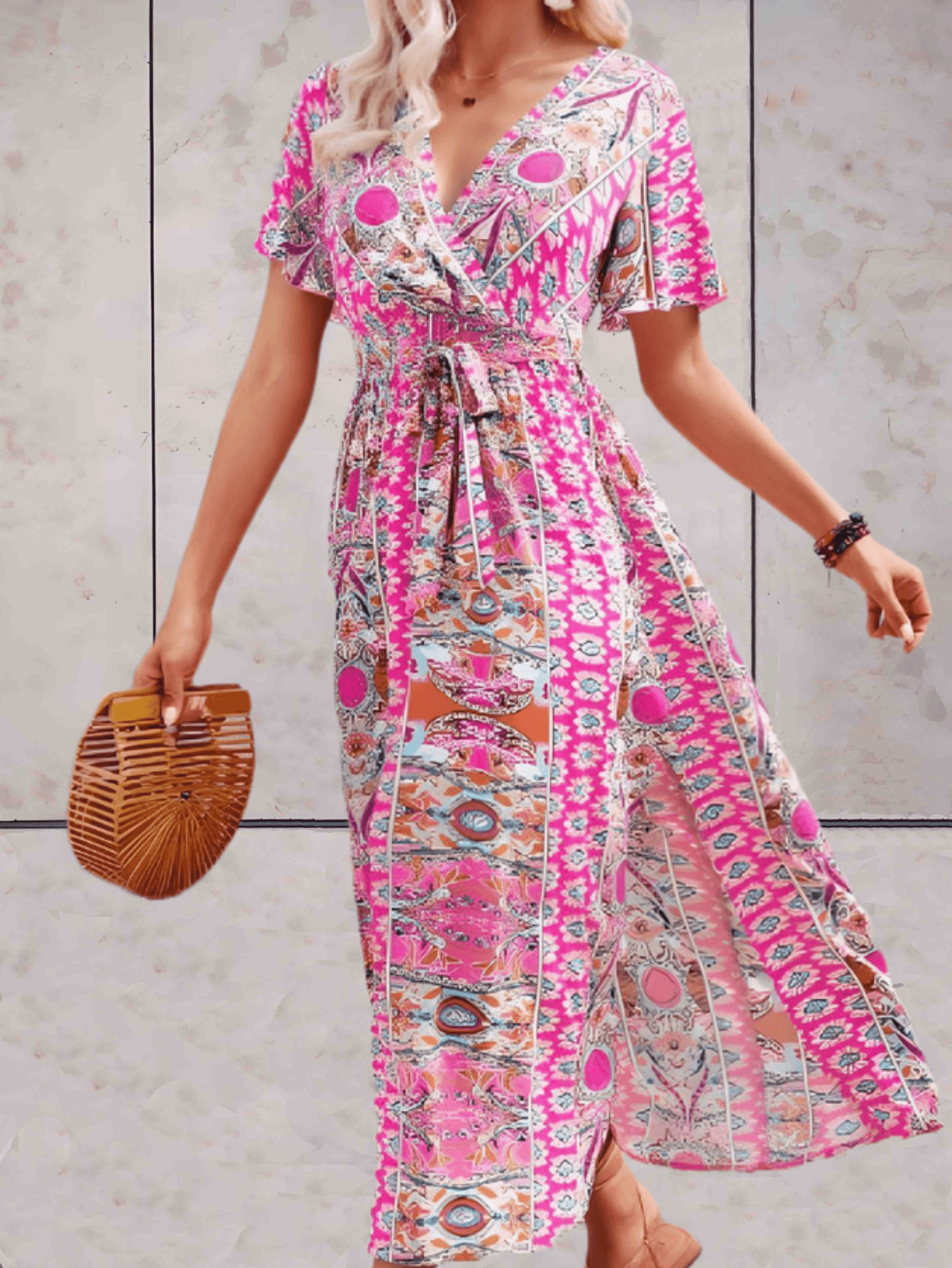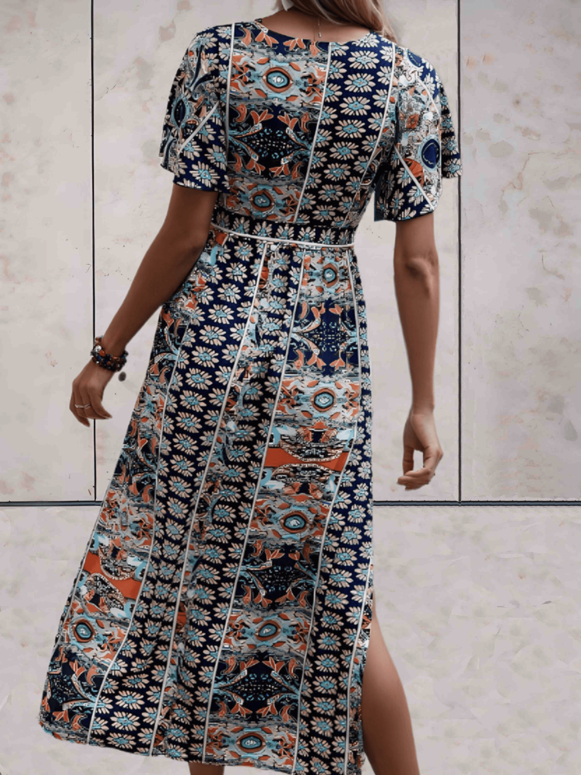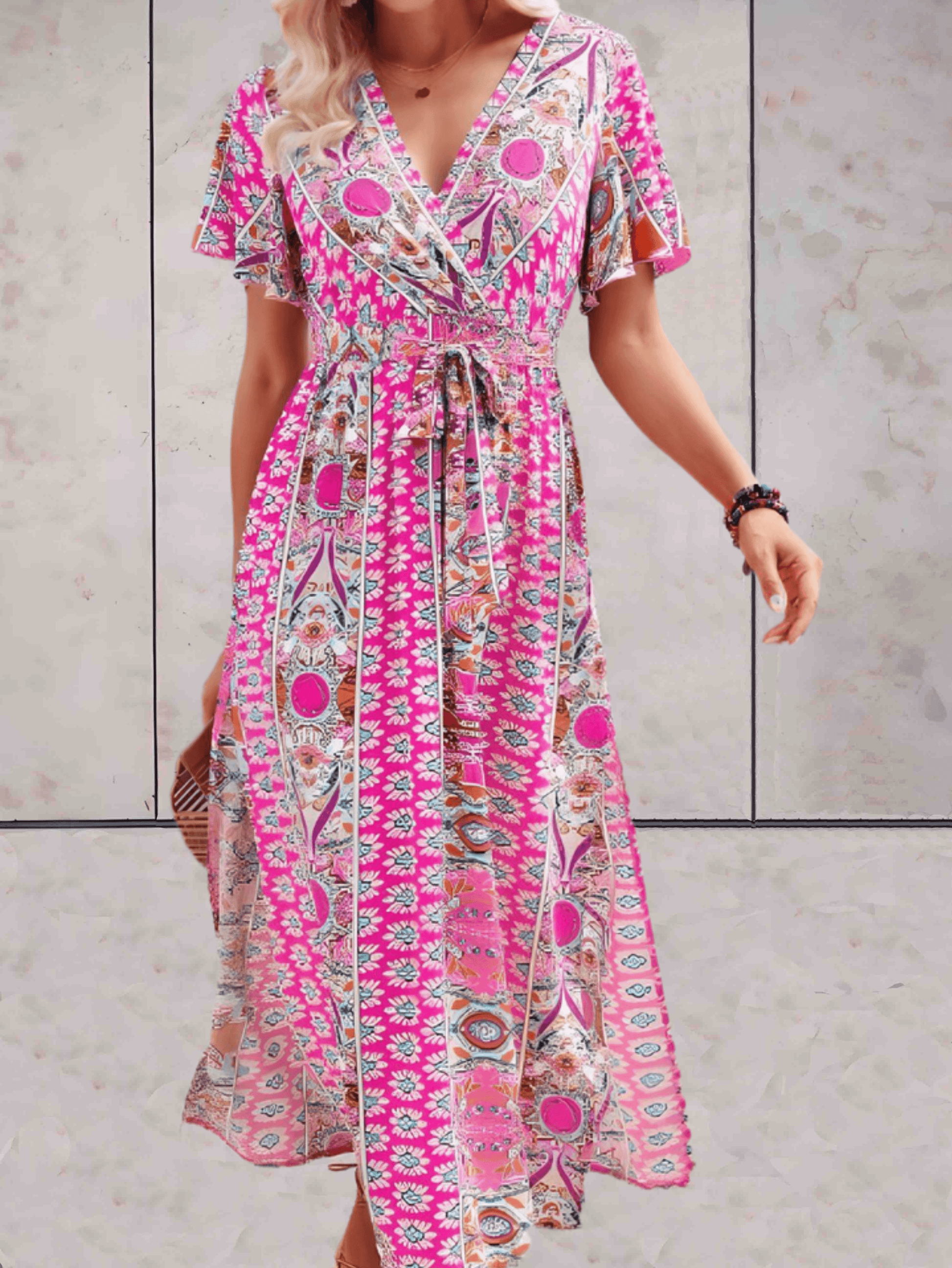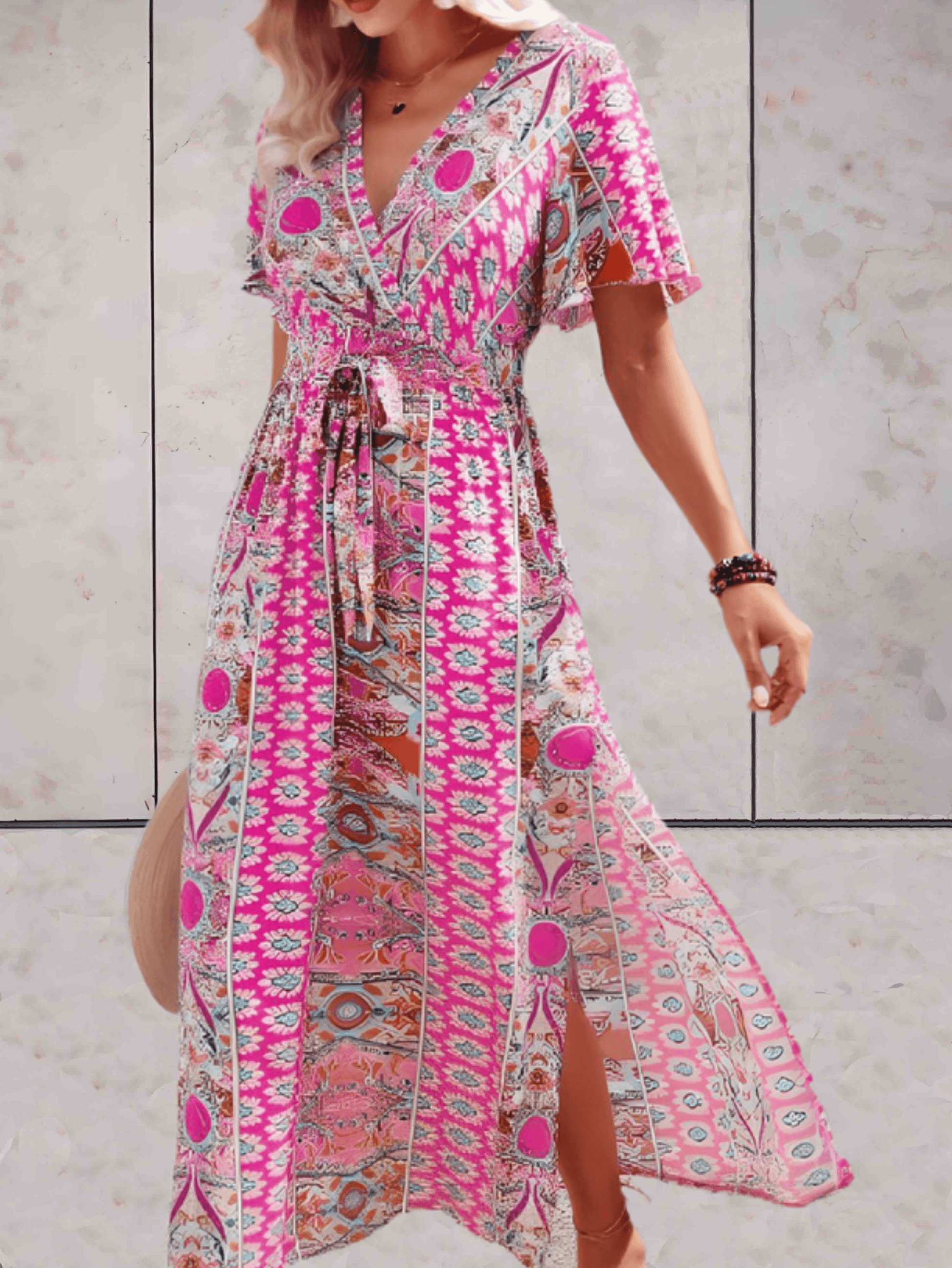 Unser charmantes Wickelkleid mit V-Ausschnitt und kurzen Ärmeln ist die perfekte Wahl für jede Gelegenheit. Das Kleid besticht durch sein einzigartiges Muster und den fließenden Schnitt, der eine elegante und feminine Silhouette kreiert. Der hohe Schlitz sorgt für eine ansprechende Note und bietet gleichzeitig Bewegungsfreiheit. Mit dem Bindegürtel können Sie die Passform individuell anpassen und Ihren Look stilvoll abrunden. Egal, ob Sie einen Tag in der Stadt verbringen oder eine Abendveranstaltung besuchen, dieses vielseitige Kleid verspricht, Sie stilvoll und komfortabel zu begleiten.