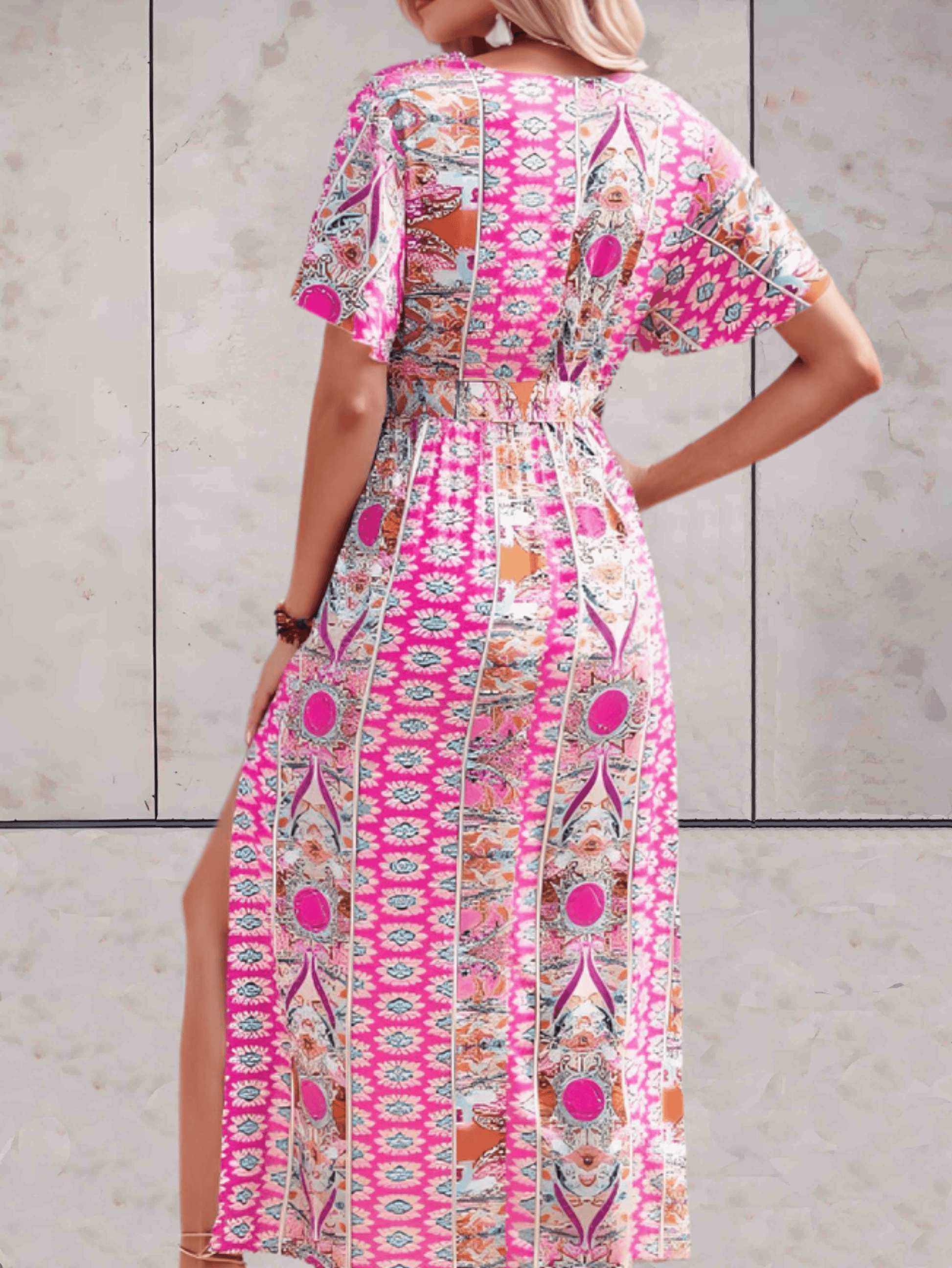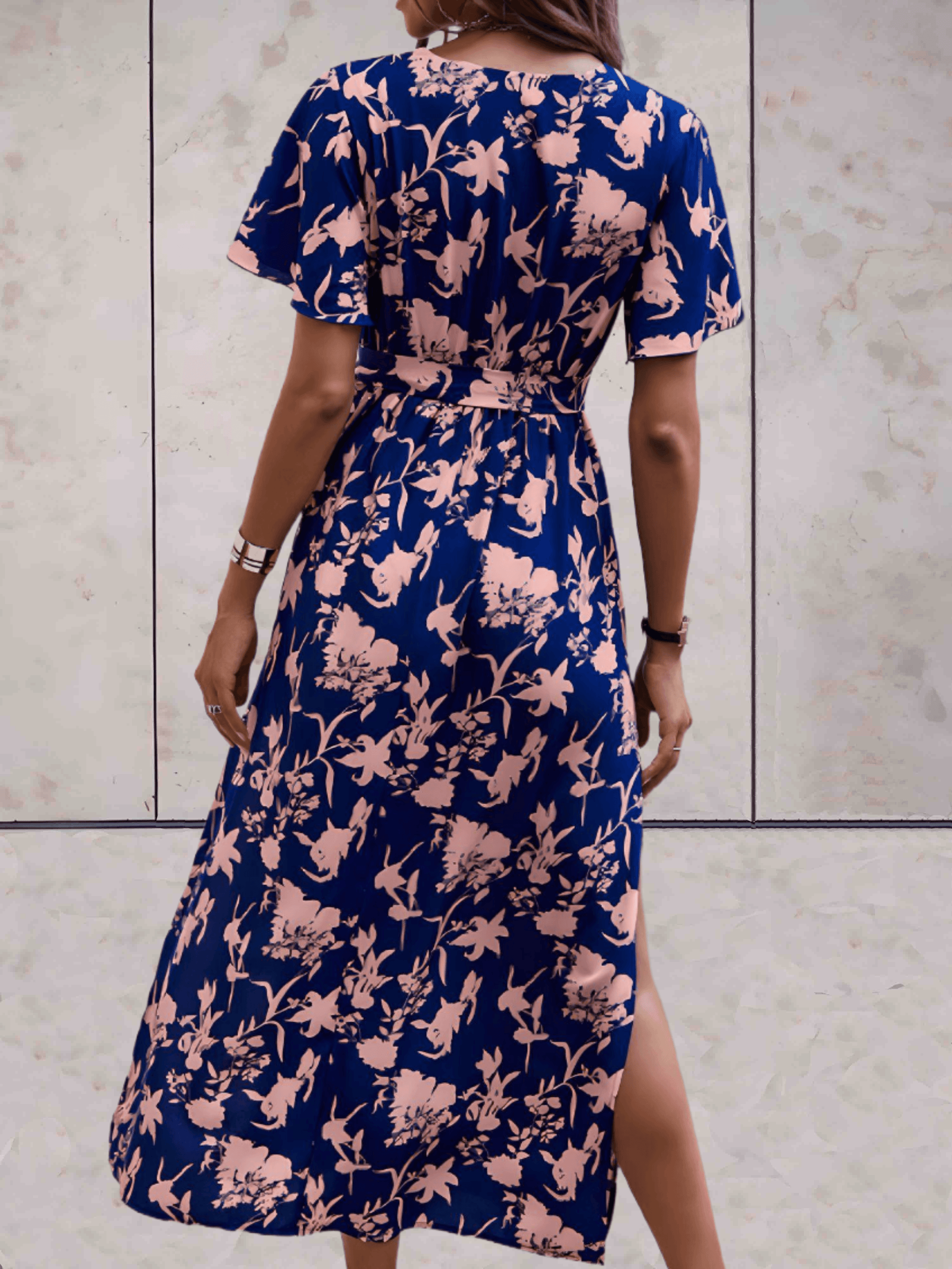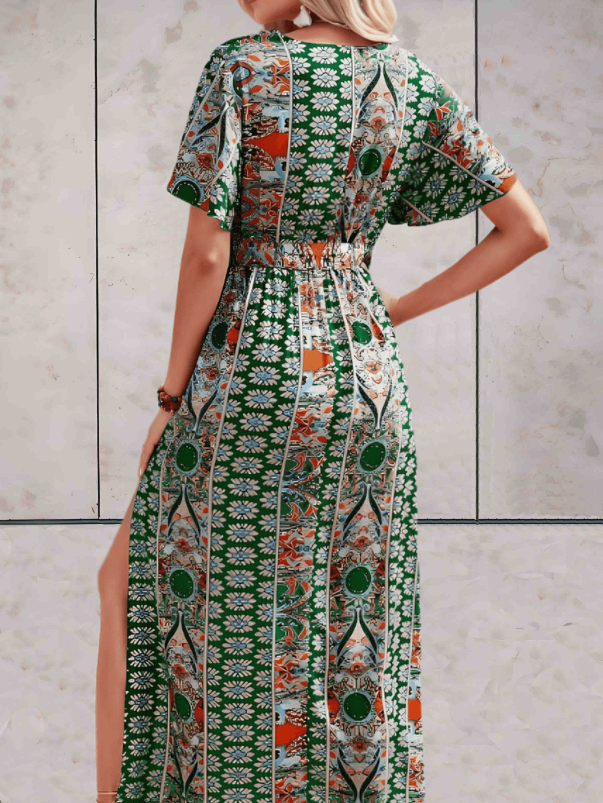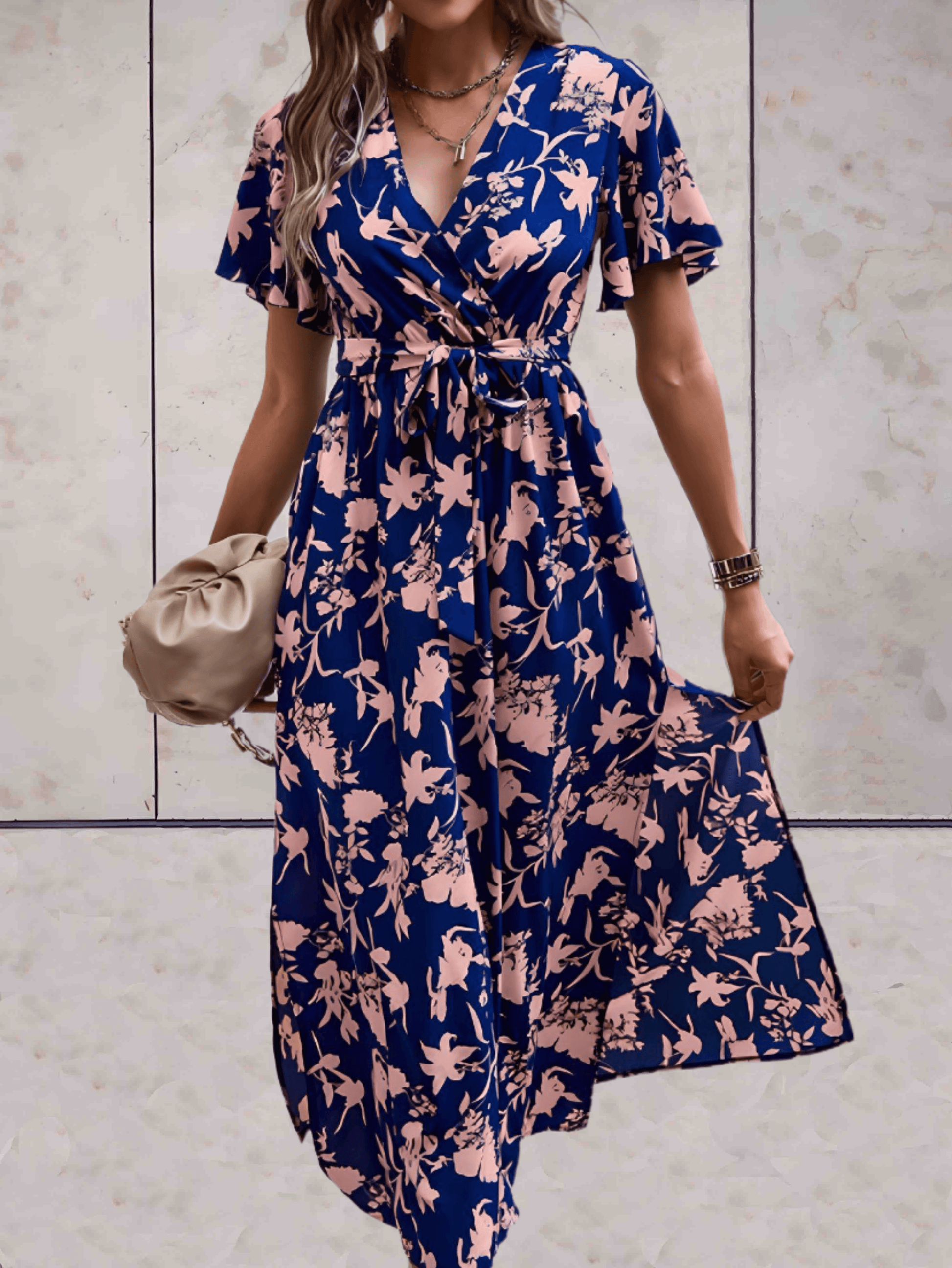 Unser charmantes Wickelkleid mit V-Ausschnitt und kurzen Ärmeln ist die perfekte Wahl für jede Gelegenheit. Das Kleid besticht durch sein einzigartiges Muster und den fließenden Schnitt, der eine elegante und feminine Silhouette kreiert. Der hohe Schlitz sorgt für eine ansprechende Note und bietet gleichzeitig Bewegungsfreiheit. Mit dem Bindegürtel können Sie die Passform individuell anpassen und Ihren Look stilvoll abrunden. Egal, ob Sie einen Tag in der Stadt verbringen oder eine Abendveranstaltung besuchen, dieses vielseitige Kleid verspricht, Sie stilvoll und komfortabel zu begleiten.