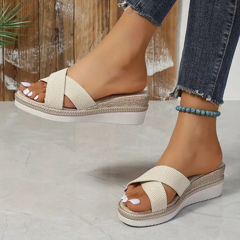 Treten Sie in die mühelose Eleganz unserer Chic Criss-Cross Keilabsatz Sandalen. Mit einem stilvollen Design, das perfekt für jeden Anlass ist, bestechen diese Sandalen durch eine exquisite gewebte Textur und einen erhöhten Keilabsatz für zusätzliche Höhe und Komfort. Der weiche, neutrale Ton passt problemlos zu jedem Outfit, von lässigen Jeans bis hin zu fließenden Sommerkleidern.