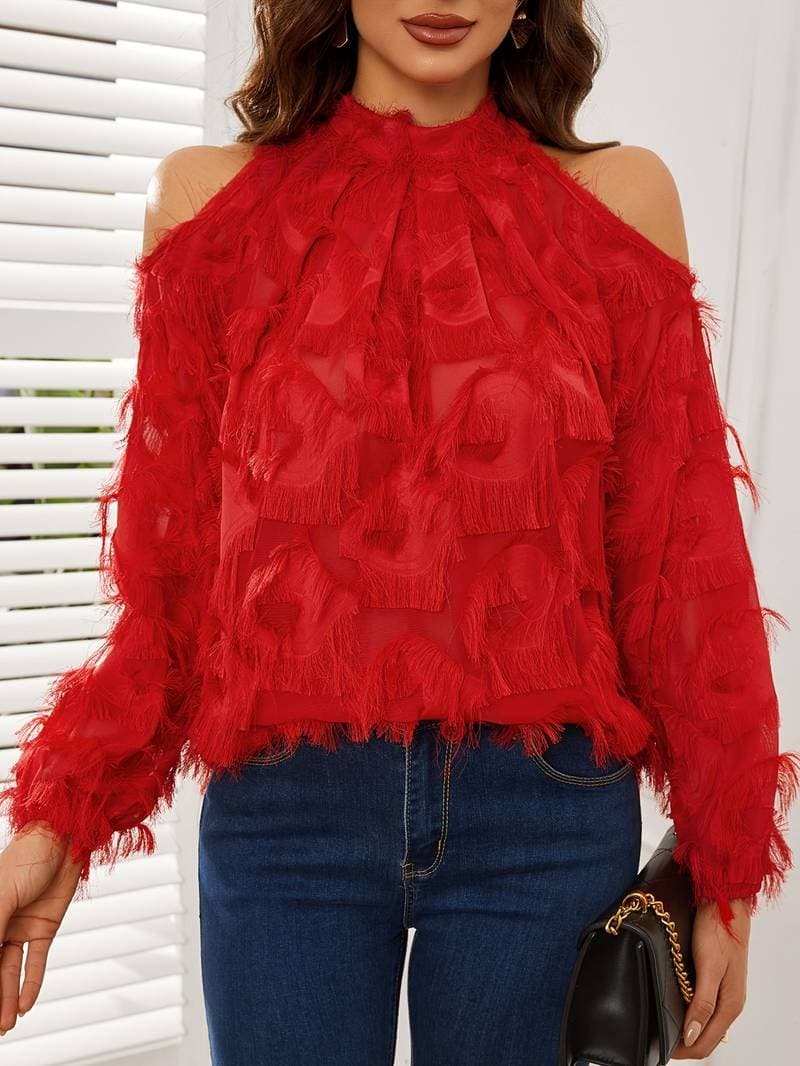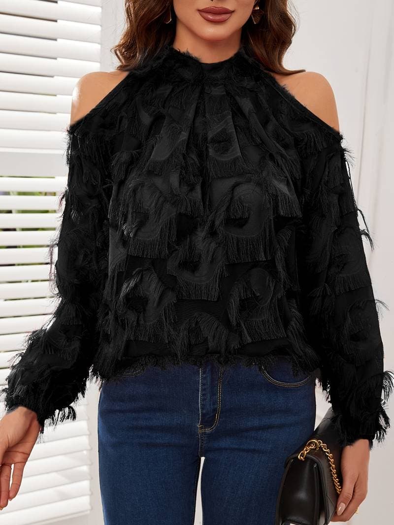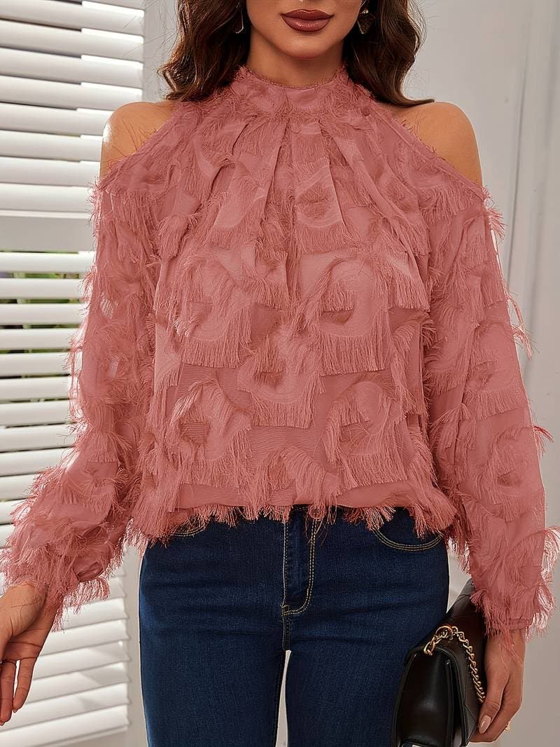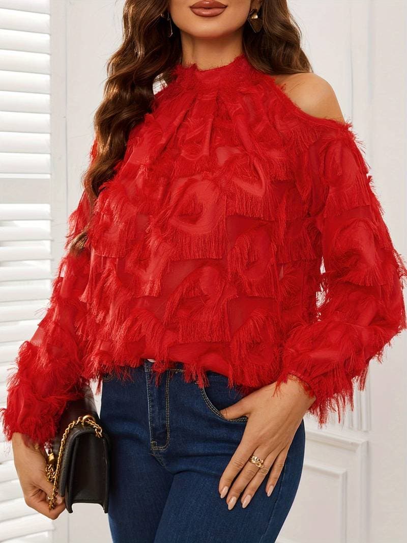 Entfesseln Sie Ihren gewagten Stil mit unserer exquisiten, silbergefederten Cascade-Bluse. Dieses atemberaubende Stück zeichnet sich durch einen hohen Halsausschnitt aus, der eine anspruchsvolle Atmosphäre verleiht, während das Design mit freien Schultern einen trendigen, sinnlichen Reiz verleiht. Die Bluse ist kunstvoll mit komplizierten, federähnlichen Verzierungen geschmückt, die ein luxuriöses, texturales Fest für die Augen bieten.