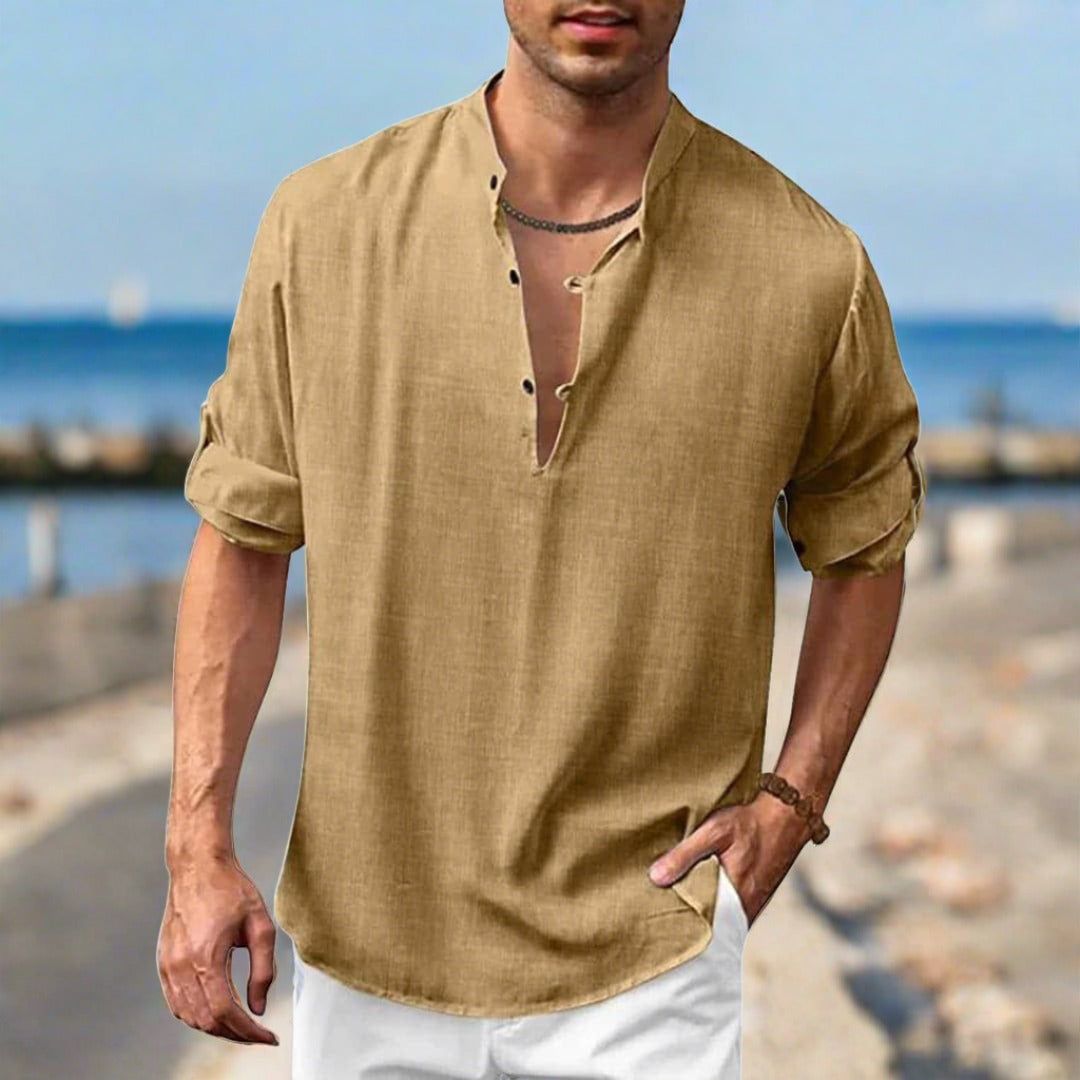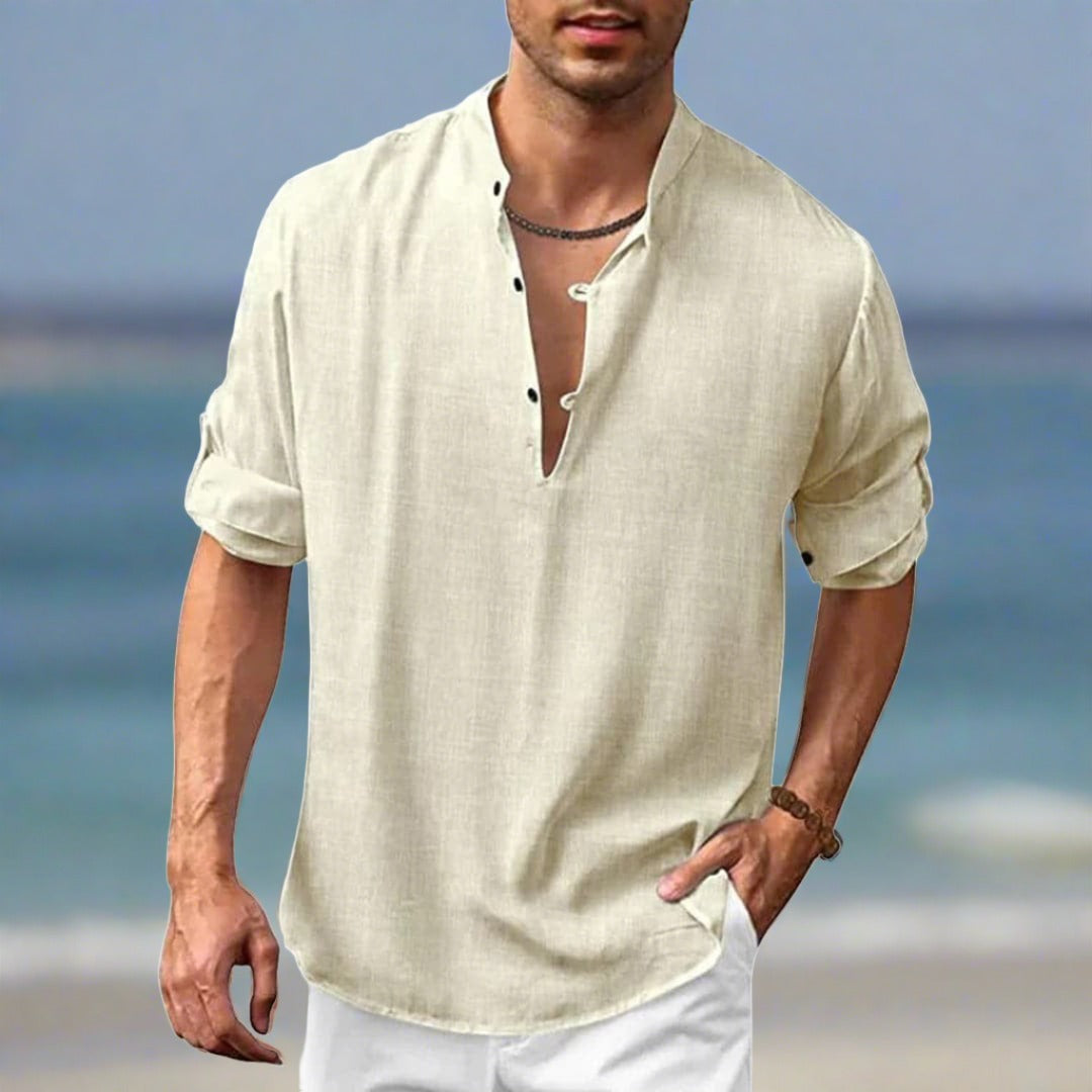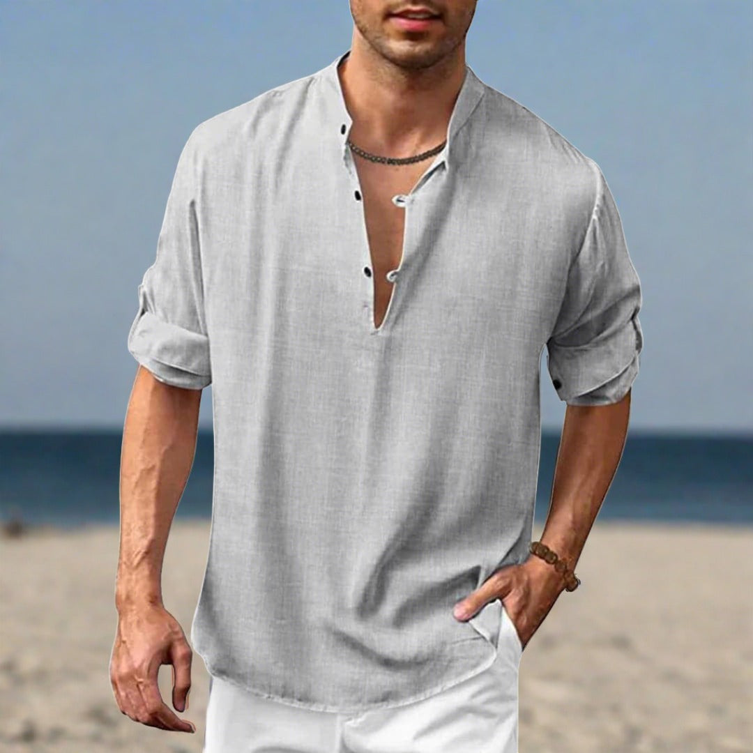 Entworfen mit dem modernen Mann im Kopf, verfügt es über einen stilvollen Stehkragen und eine lässige halbe Knopfleiste, die eine entspannte und dennoch anspruchsvolle Atmosphäre ausstrahlt. Die hochgekrempelten Ärmel sind mit einem Knopfriegel gesichert und bieten sowohl Funktionalität als auch einen zusätzlichen Hauch von lässiger Raffinesse.