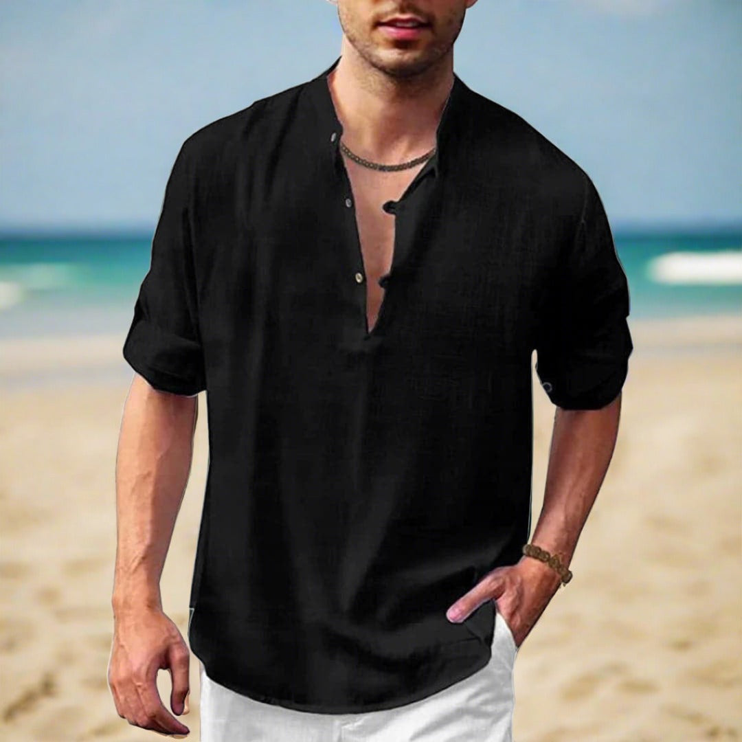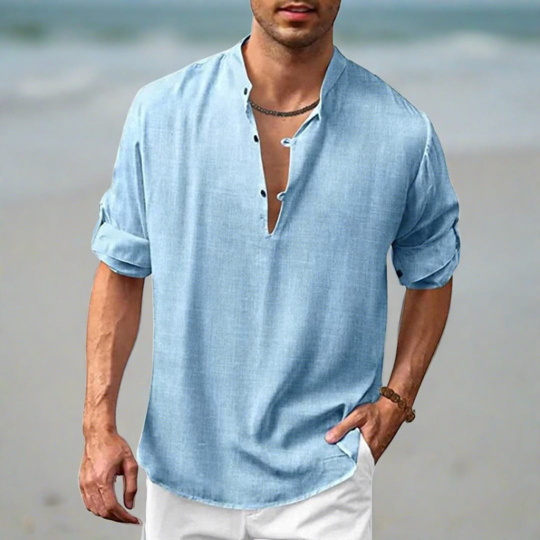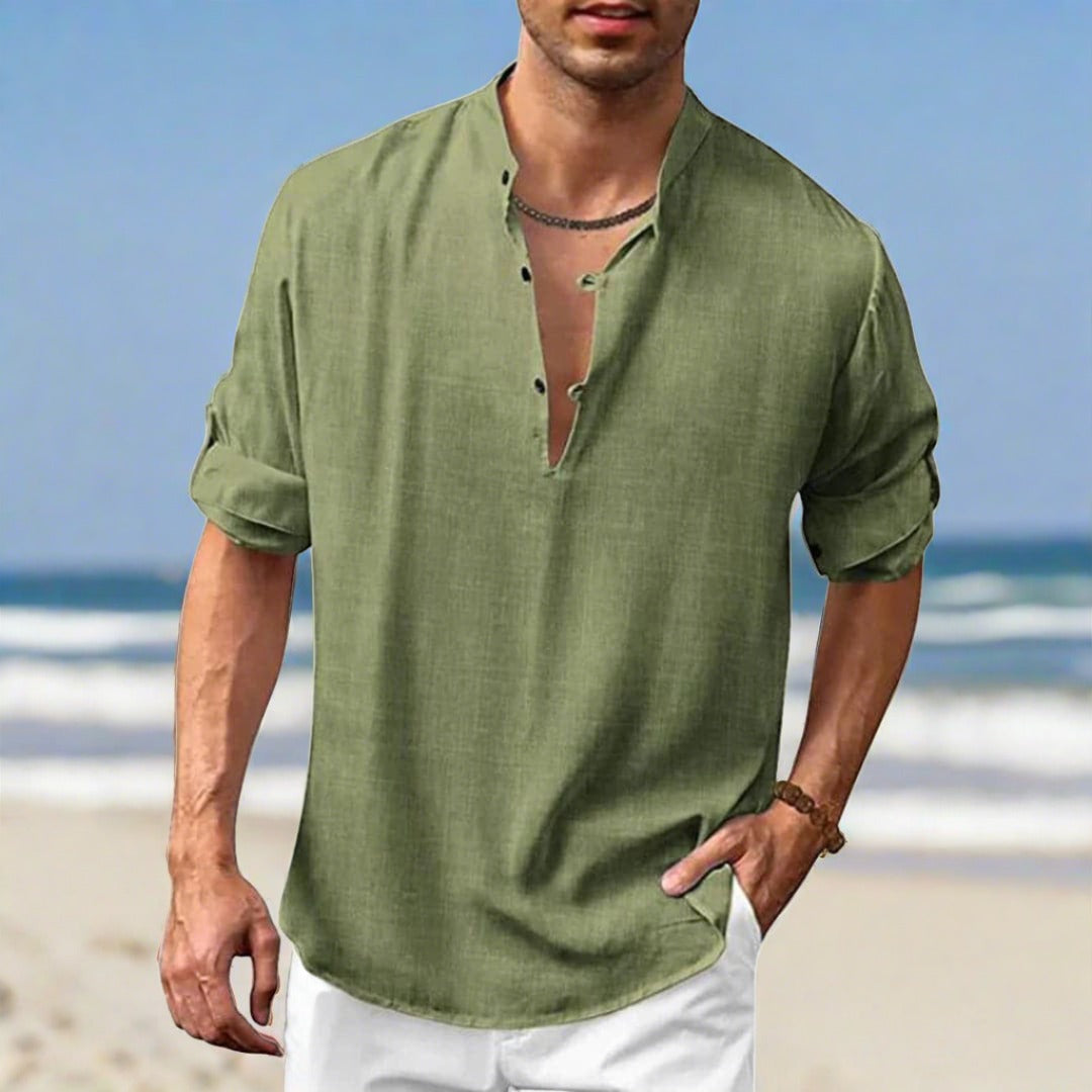 Entworfen mit dem modernen Mann im Kopf, verfügt es über einen stilvollen Stehkragen und eine lässige halbe Knopfleiste, die eine entspannte und dennoch anspruchsvolle Atmosphäre ausstrahlt. Die hochgekrempelten Ärmel sind mit einem Knopfriegel gesichert und bieten sowohl Funktionalität als auch einen zusätzlichen Hauch von lässiger Raffinesse.