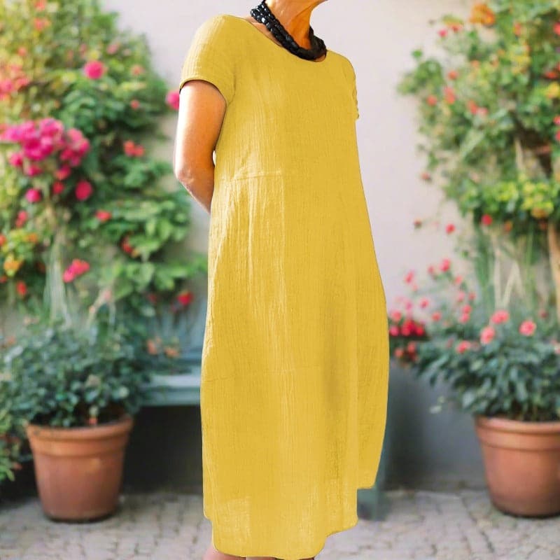 Erleben Sie die Essenz des Sommers mit unserem lebendigen Leinen-Midi-Kleid. Dieses wunderschöne Stück verkörpert entspannte Eleganz und sorgt mit seiner atemberaubenden Farbgebung für einen fröhlichen Farbtupfer in Ihrer Garderobe.