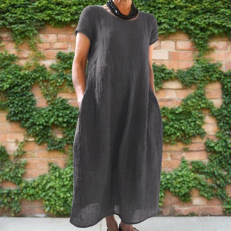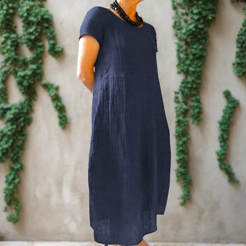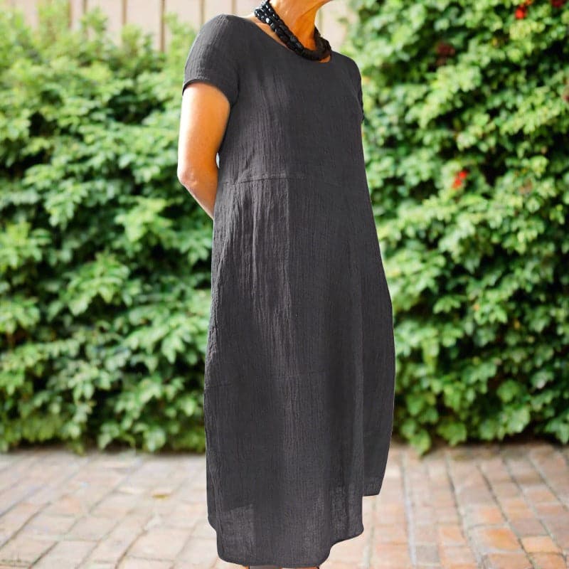 Das Design vereint Schlichtheit und Raffinesse, mit einer lockeren, fließenden Silhouette, die sich bis zur Midi-Länge erstreckt. Der runde Ausschnitt wird durch einzigartige Perlenakzente hervorgehoben, die einen handwerklichen Touch verleihen, perfekt für diejenigen, die detaillierte Handwerkskunst schätzen. Kurze Ärmel machen dieses Kleid ideal für einen lässigen Tag oder eine festliche Gartenparty.