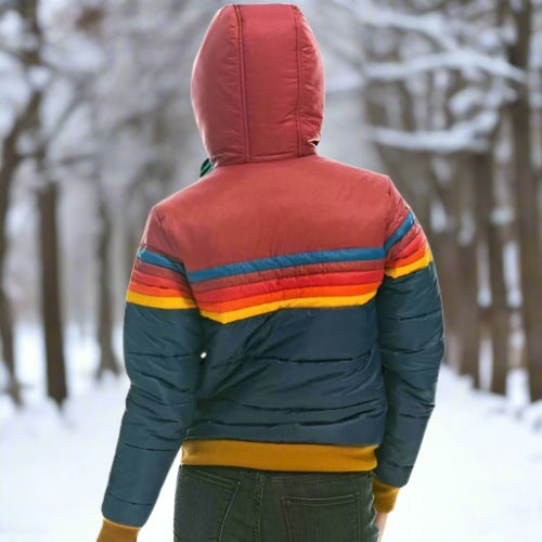 Beleben Sie Ihre Wintergarderobe mit unserer Vintage-inspirierten Color Block Daunenjacke! Die kühne Kombination aus leuchtendem Blau, kräftigem Rot und warmem Orange, akzentuiert durch retro-inspirierte Streifen, macht diese Jacke nicht nur zu einer gemütlichen Schicht, sondern auch zu einem Statement-Piece. Der hohe Kragen bietet zusätzlichen Schutz vor der Kälte, während die eng anliegenden Bündchen die Wärme einschließen und dafür sorgen, dass Sie den ganzen Tag über warm bleiben.