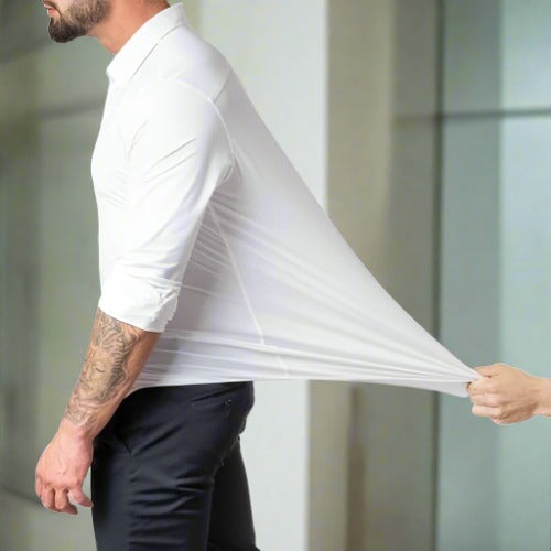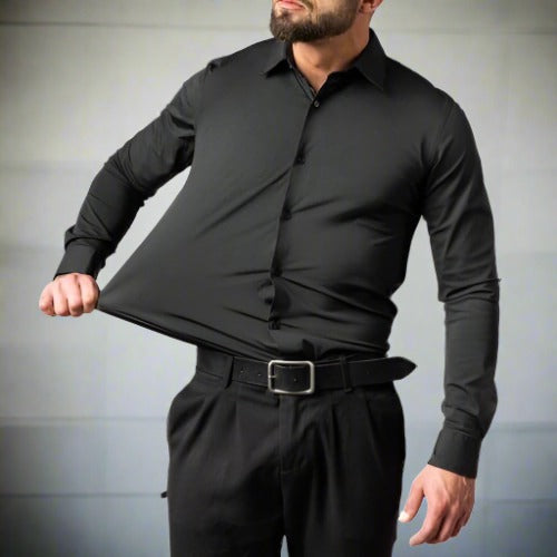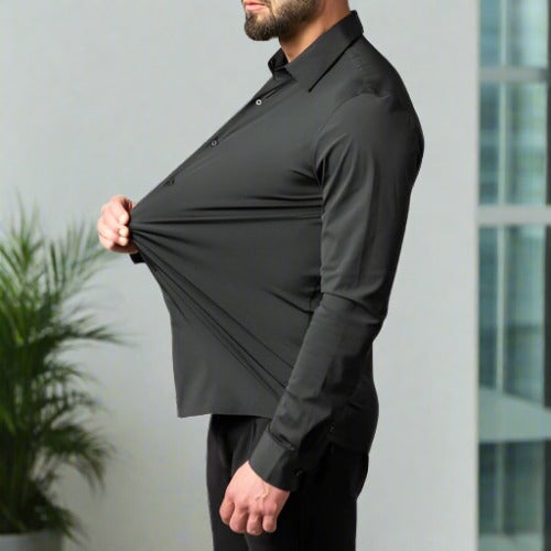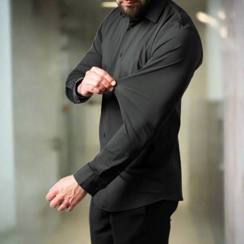 Dieses Hemd ist mit einer klassischen Knopfleiste und langen Ärmeln ausgestattet. Es besteht aus einem dehnbaren Material, das für eine bequeme Passform sorgt und sich der Körperform anpasst. Der Kragen ist schlicht und funktional, und das Hemd lässt sich sowohl im Alltag als auch für formellere Anlässe tragen.