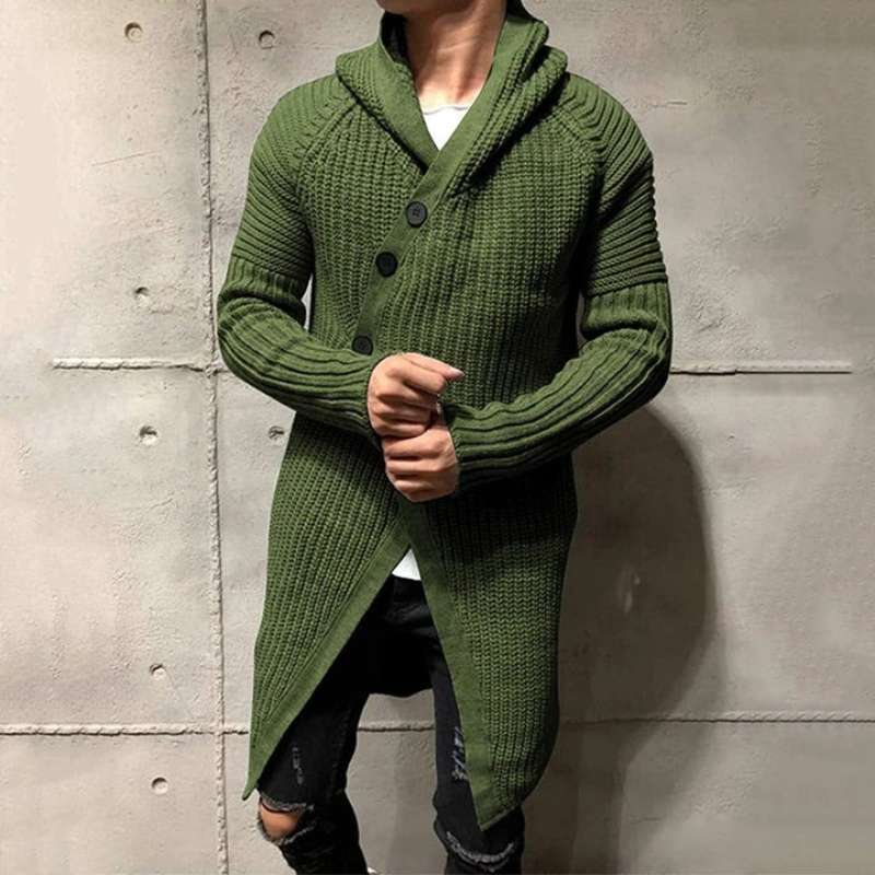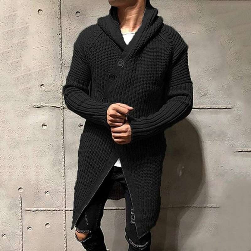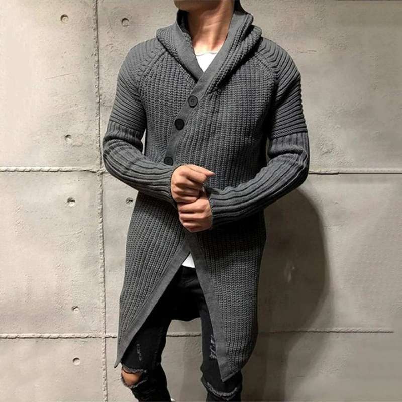 Steigern Sie Ihr Layering-Spiel mit diesem stilvollen, lang geschnittenen Strick-Cardigan mit Kapuze, sorgfältig gefertigt für diejenigen, die einen modernen Twist auf klassischem Komfort schätzen. Dieser Cardigan zeichnet sich durch ein markantes Rippstrickmuster aus, das sowohl Textur als auch visuelle Anziehungskraft bietet.