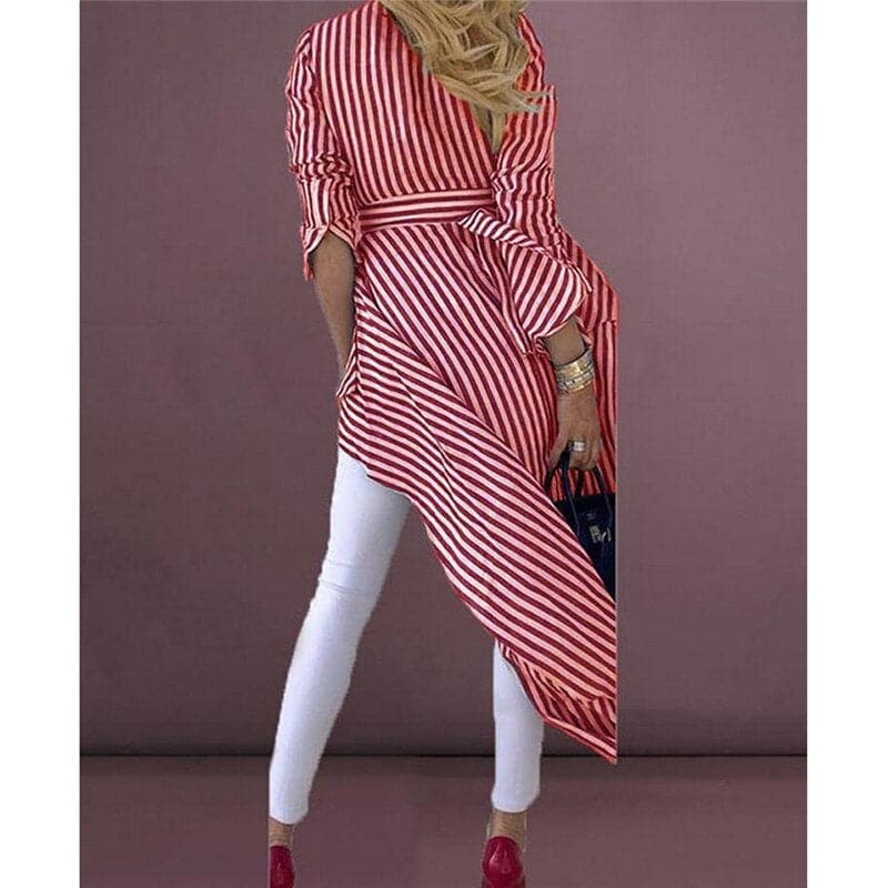 Verleihen Sie Ihrem Stil mit diesem schicken und anspruchsvollen Ensemble einen Hauch von Eleganz und Wagemut. Das Outfit besteht aus einer wunderschön maßgeschneiderten Wickelbluse mit langen Ärmeln und kühnen Streifen, die Selbstbewusstsein und Anmut ausstrahlen. Der Schnitt der Bluse betont die Figur und schafft eine Sanduhr-Silhouette.