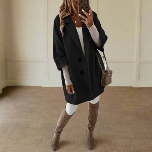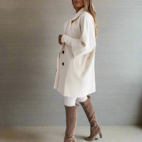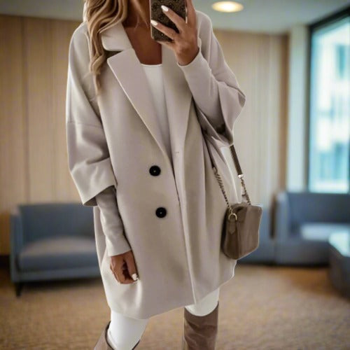 Der Mantel zeichnet sich durch einen scharfen Kragen aus, der einen professionellen Touch verleiht, während die doppelt geknöpfte Front mit kontrastierenden Knöpfen einen klassischen Charme ausstrahlt. Die klaren Linien und der ruhige Farbton machen ihn zu einer vielseitigen Wahl, bereit, jedes Ensemble von einem lässigen Tag bis zu einem formelleren Abendereignis zu ergänzen.