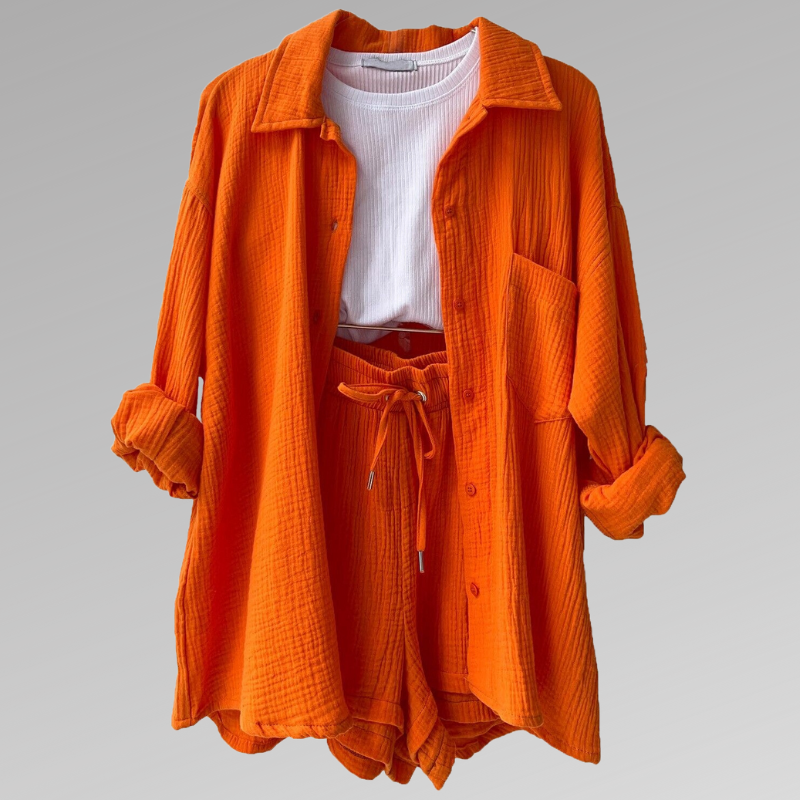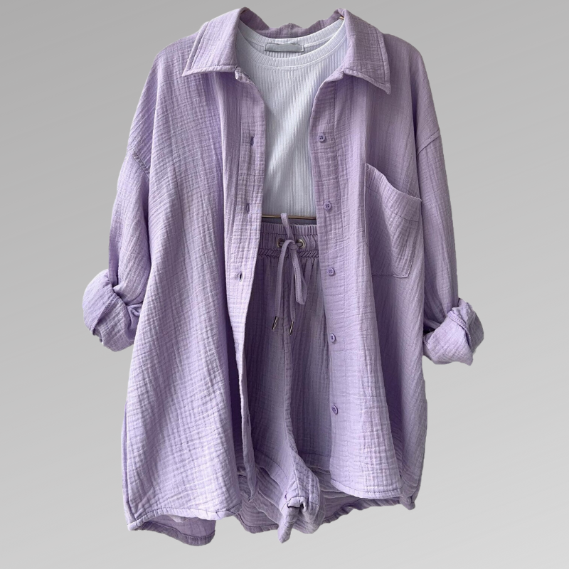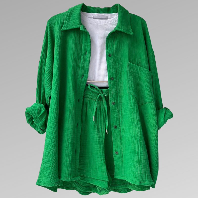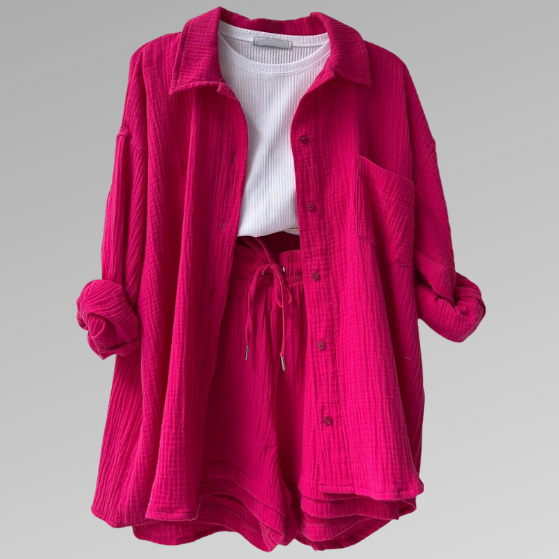 Verkörpern Sie mühelose Eleganz mit unserem perfekt abgestimmten Set, bestehend aus einem strukturierten Overshirt und passenden Shorts mit hoher Taille. Dieses vielseitige Ensemble bietet Komfort und Stil für den modebewussten Individualisten.