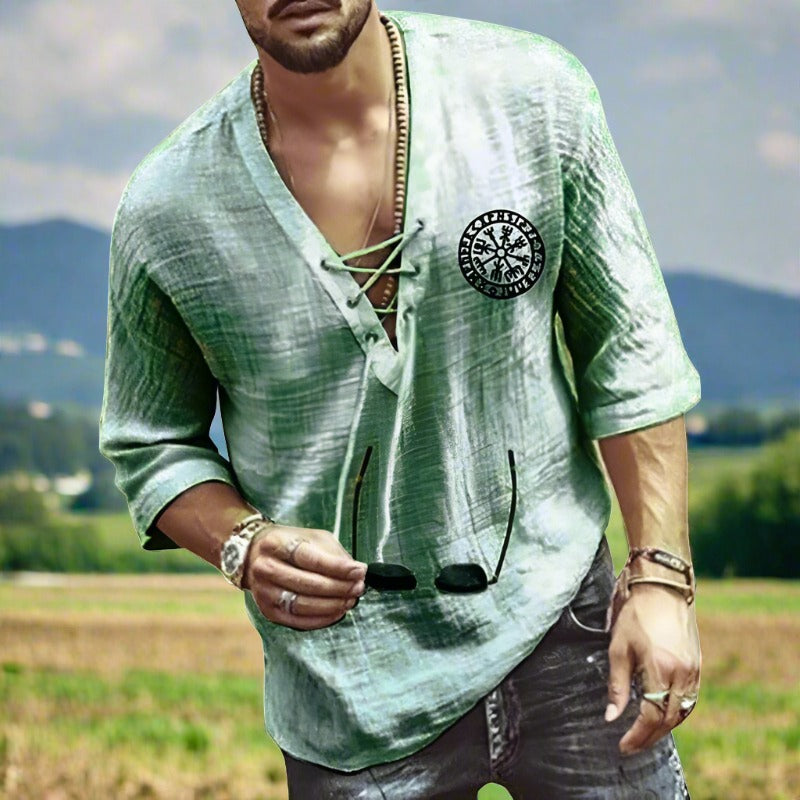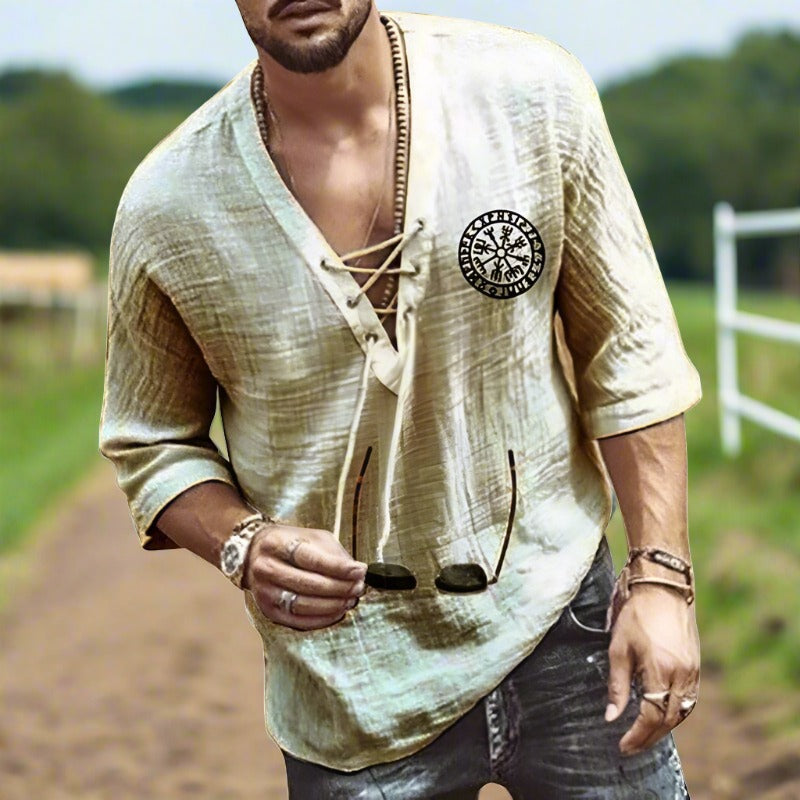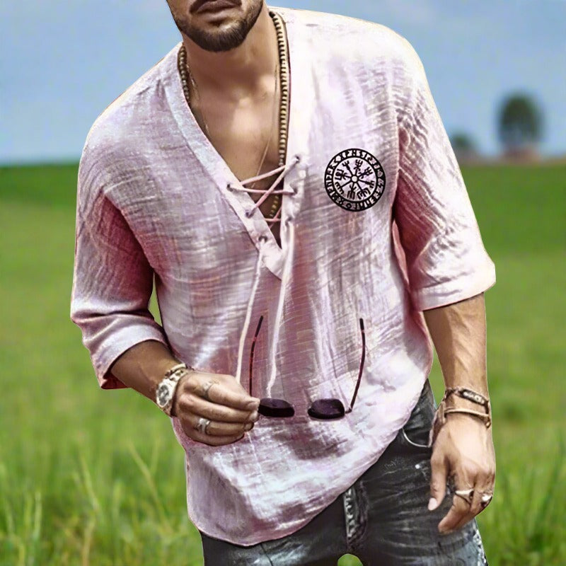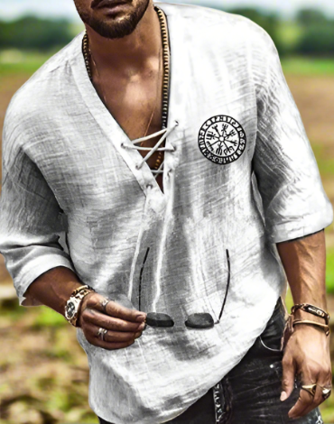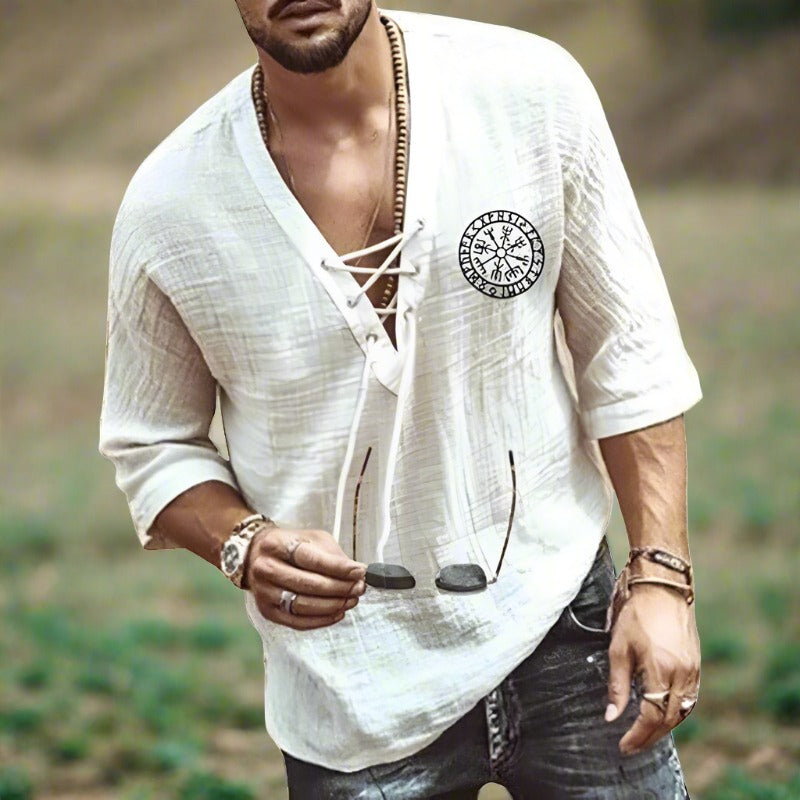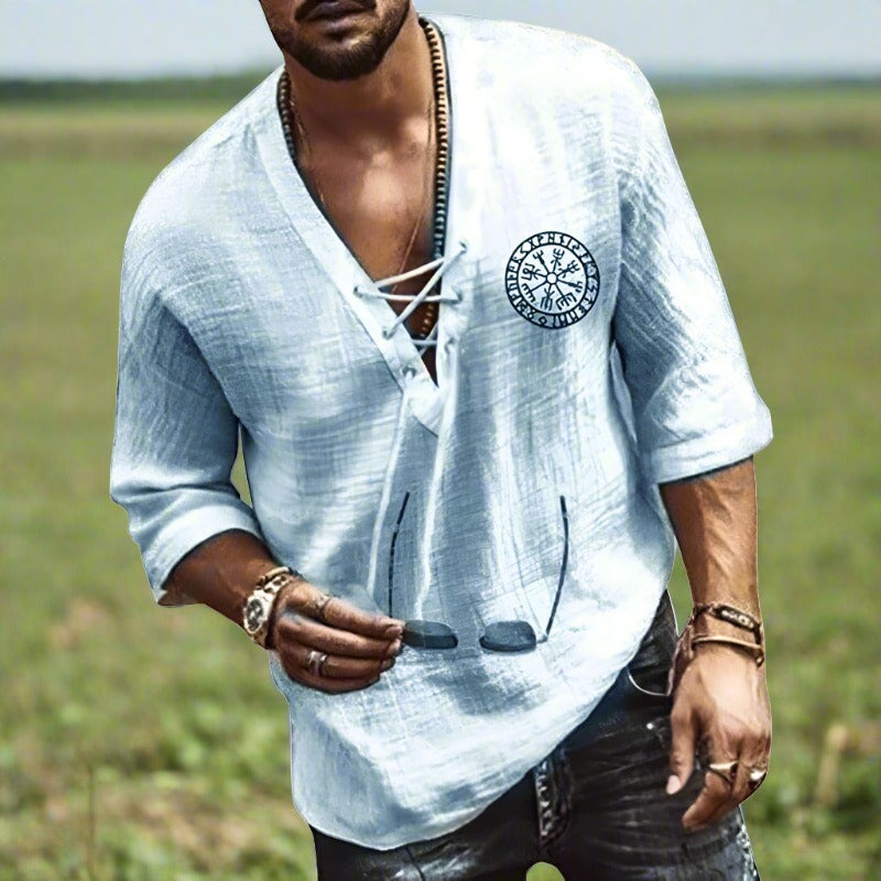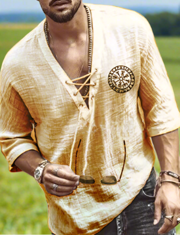 Das einzigartige Design mit Schnürung vorne verleiht Ihrem Outfit einen Hauch von Bohème-Charme, während der subtile Kompass-ähnliche Druck auf der Brust seine entspannte, abenteuerliche Atmosphäre unterstreicht. Mit hochgekrempelten Ärmeln für einen lässigen, aber dennoch gepflegten Look, ist es für verschiedene Anlässe geeignet.