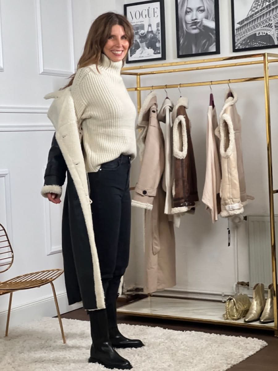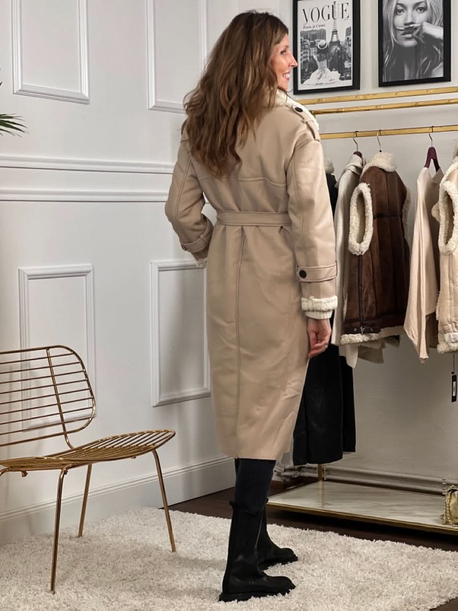 Mit Sorgfalt aus nachhaltigen, hochwertigen Stoffen gefertigt, garantiert dieser Mantel Langlebigkeit und Komfort. Ob Sie mit Freunden zum Brunch gehen oder einen Spaziergang durch die Stadt genießen, unser luxuriöser Faux Shearling Wickelmantel ist Ihr Must-Have-Außenstück in dieser Saison.