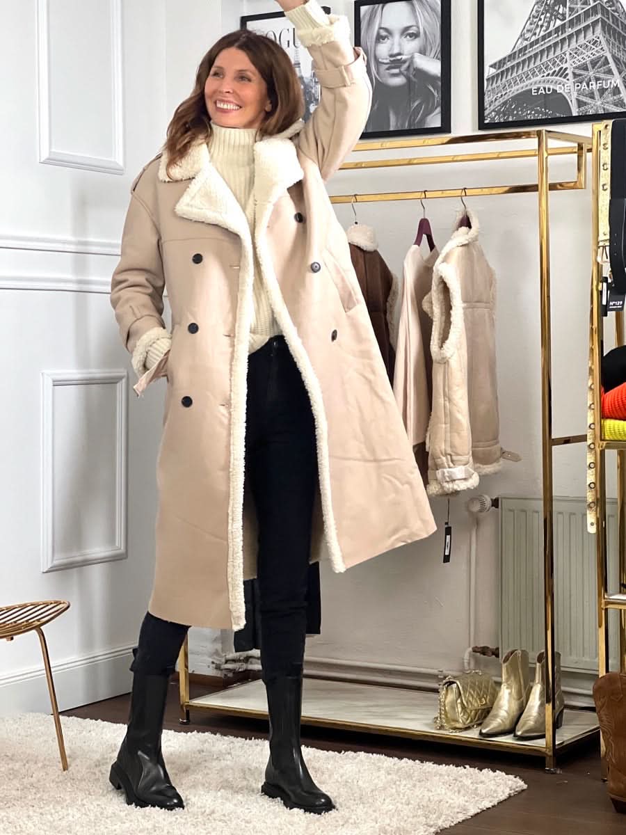 Das doppelreihige Design mit übergroßem Kragen verleiht nicht nur einen Hauch von Raffinesse, sondern bietet auch zusätzliche Wärme an kalten Tagen. Die weiche Faux Shearling-Fütterung bietet unvergleichliche Weichheit und hält Sie gemütlich, während sie ein schlankes Ästhetik beibehält. Perfekt zum Überlagern über Ihrem Lieblingsrollkragenpullover oder Pullover, dieser Mantel wechselt nahtlos von Tag zu Nacht.