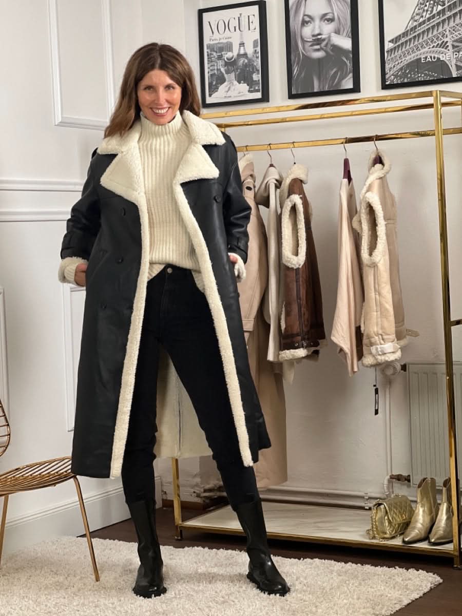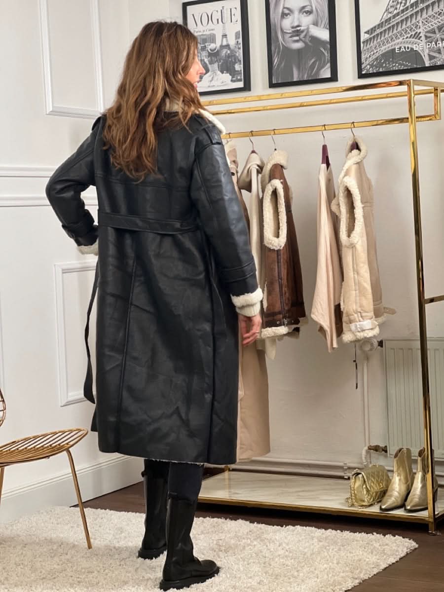 Luxuriöser langer Mantel aus veganem Shearling für Frauen
