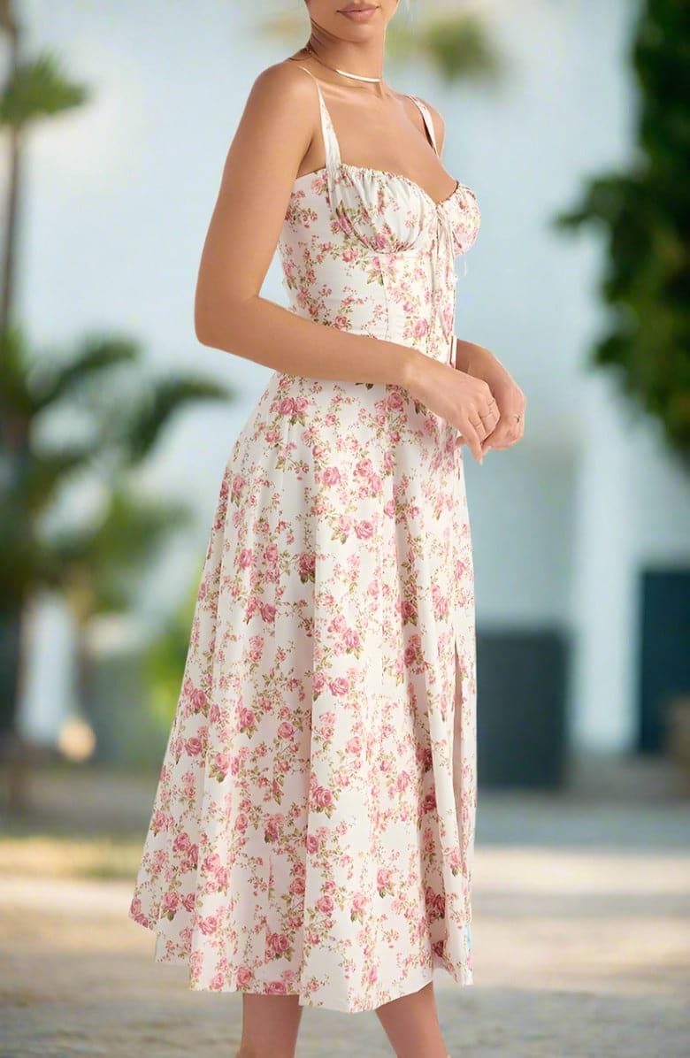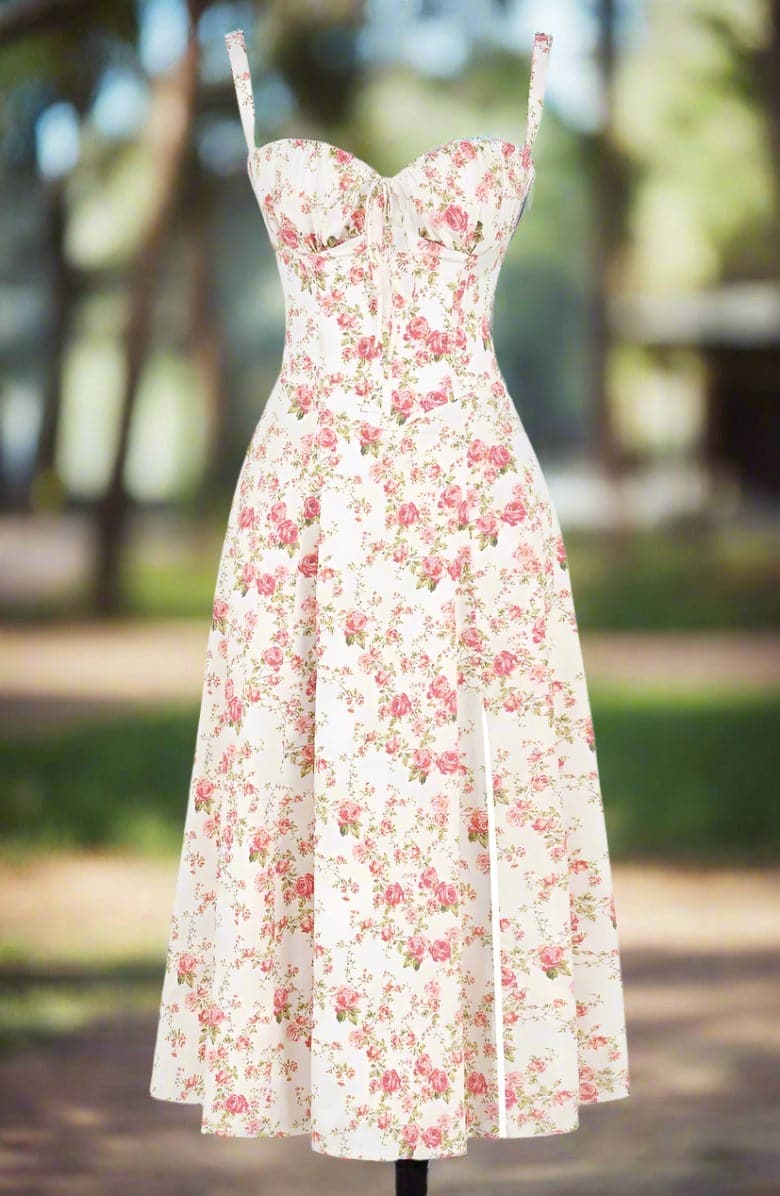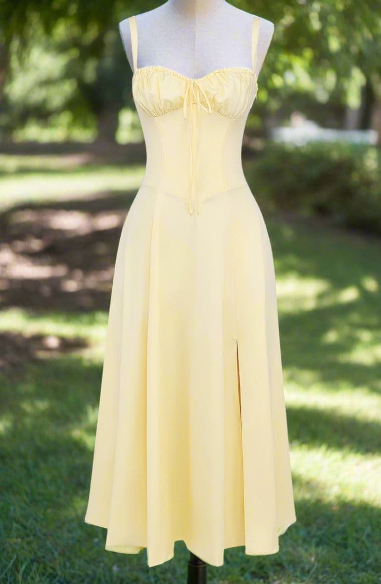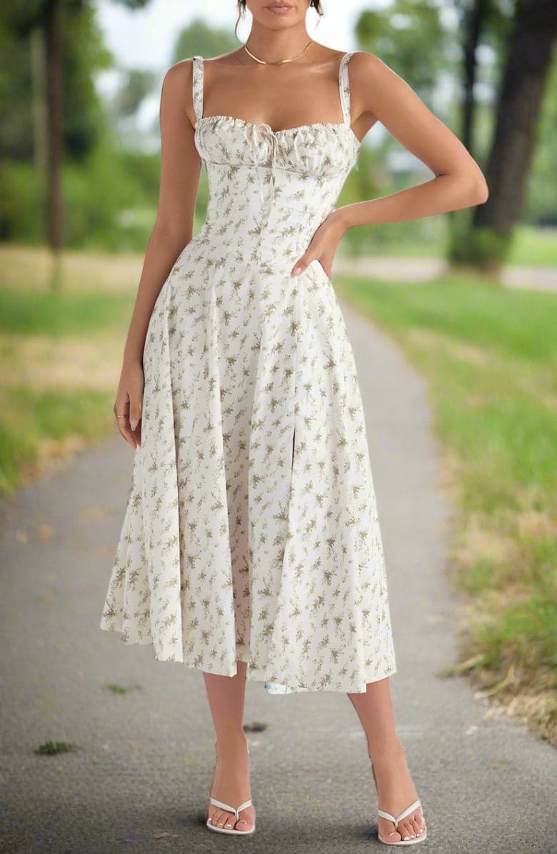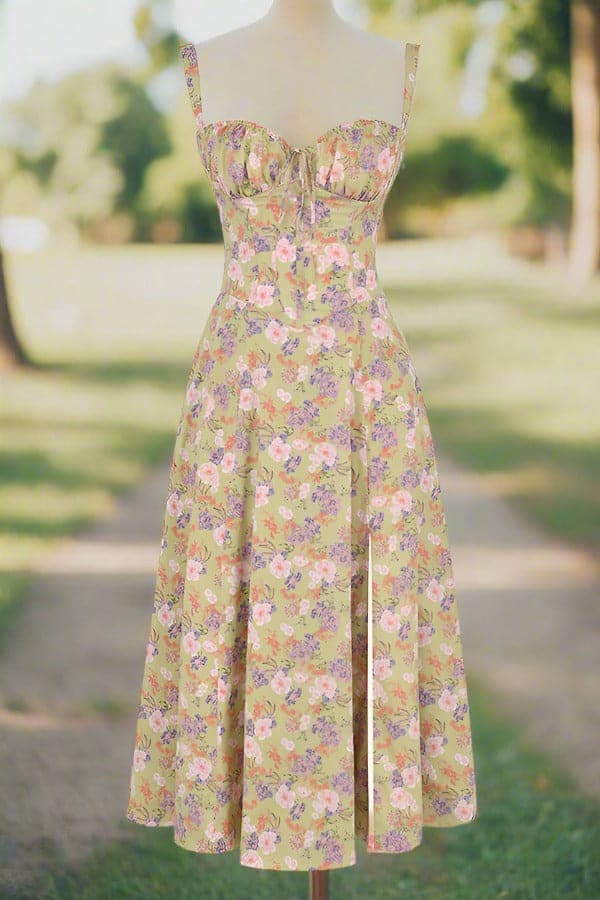 Verleihen Sie Ihrem Look mit unserem Vintage-inspirierten Blumen-Sommerkleid einen Hauch von Romantik und Weiblichkeit. Dieses charmante Kleid besticht durch ein zartes, romantisches Blumenmuster auf einem warmen, pastellgelben Hintergrund. Sein klassisches Sommerkleid-Design umfasst zarte Spaghettiträger und einen herzförmigen Ausschnitt, die Ihrem Look eine elegante und verspielte Note verleihen.
