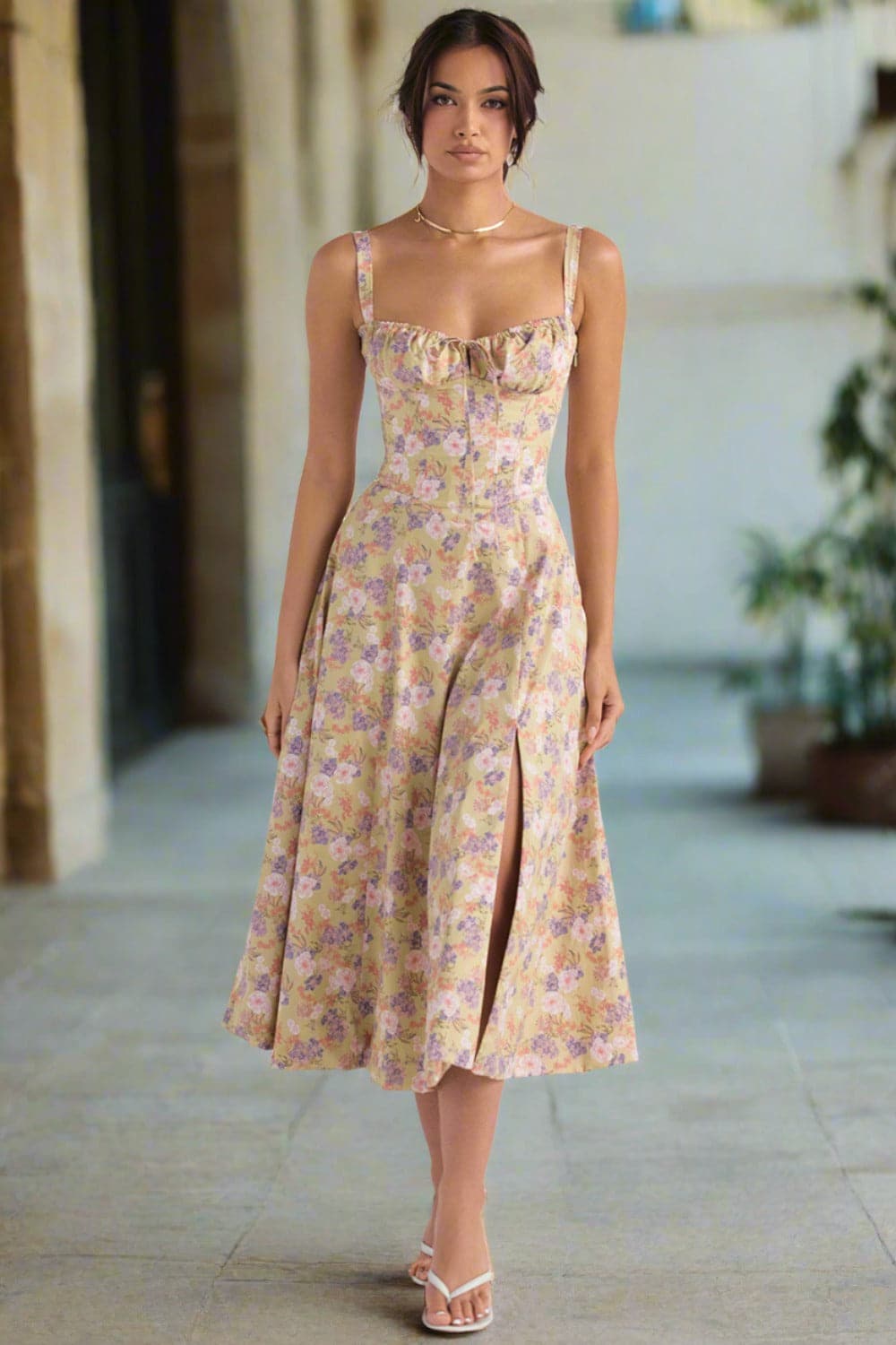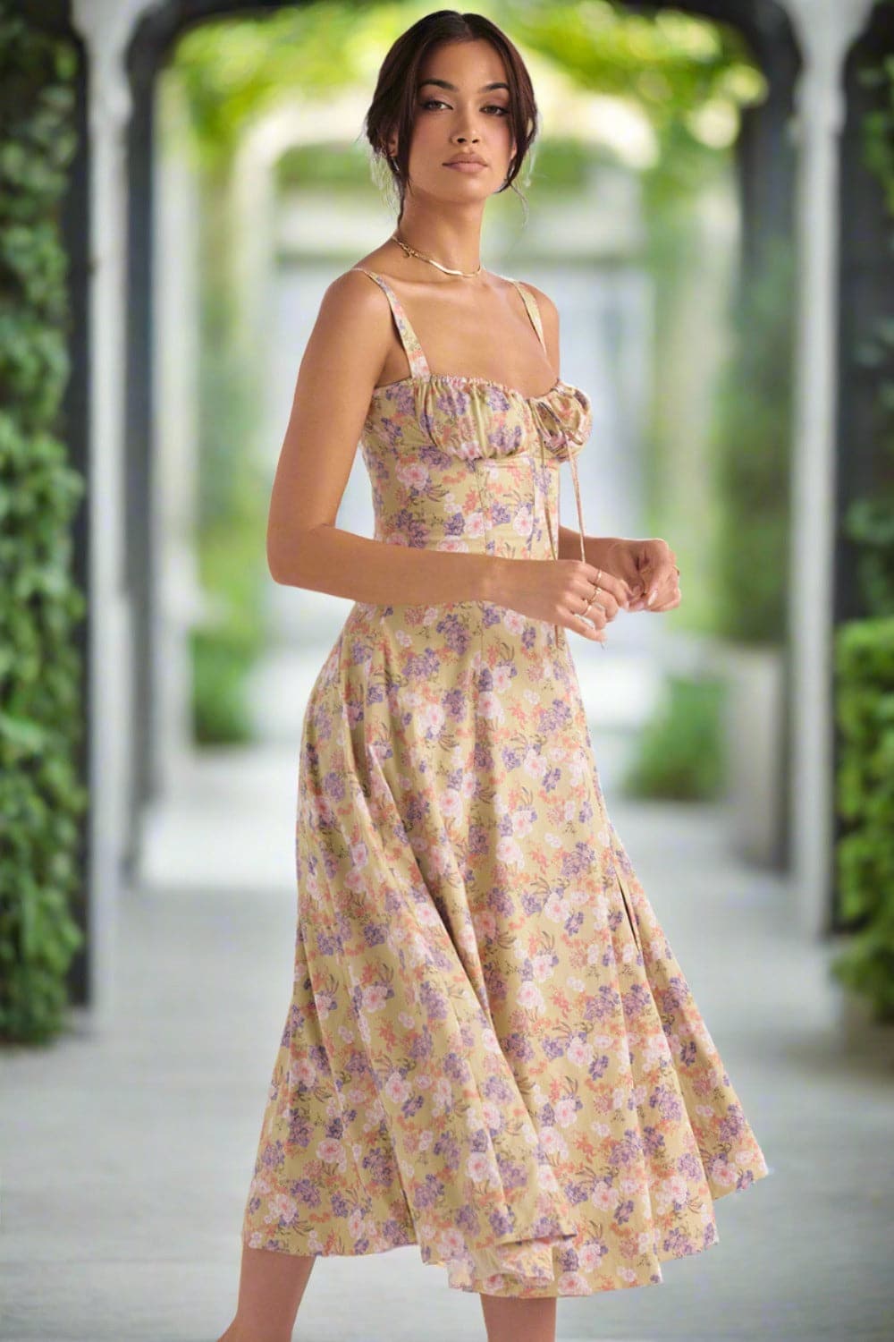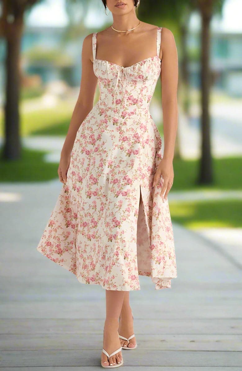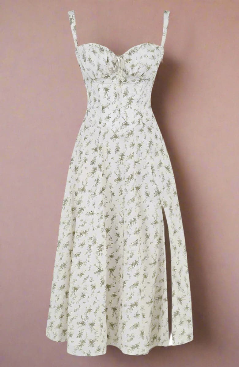 Verleihen Sie Ihrem Look mit unserem Vintage-inspirierten Blumen-Sommerkleid einen Hauch von Romantik und Weiblichkeit. Dieses charmante Kleid besticht durch ein zartes, romantisches Blumenmuster auf einem warmen, pastellgelben Hintergrund. Sein klassisches Sommerkleid-Design umfasst zarte Spaghettiträger und einen herzförmigen Ausschnitt, die Ihrem Look eine elegante und verspielte Note verleihen.