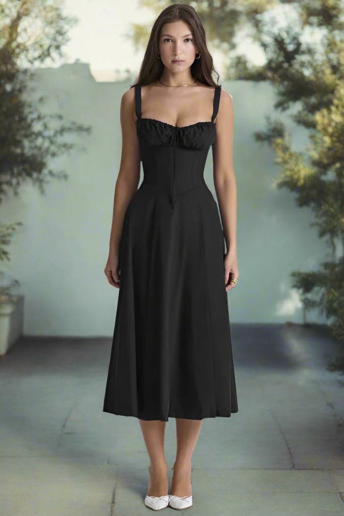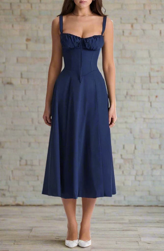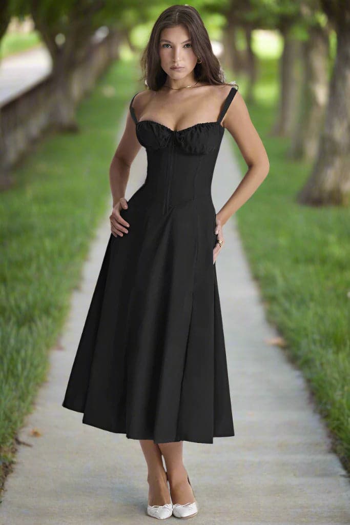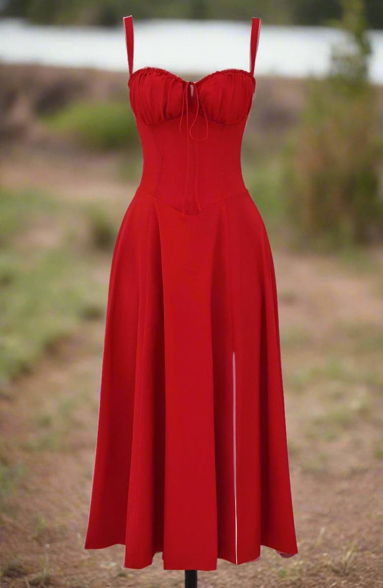 Das Kleid ist mit einem figurschmeichelnden Oberteil ausgestattet, das sanft an der Taille anliegt und in einen eleganten, knielangen Rock übergeht, der bei jedem Schritt mitschwingt. Für Komfort und Stil sorgt ein dezenter Frontschlitz, der Bewegungsfreiheit bietet und einen zusätzlichen Hauch von Verführung verleiht.