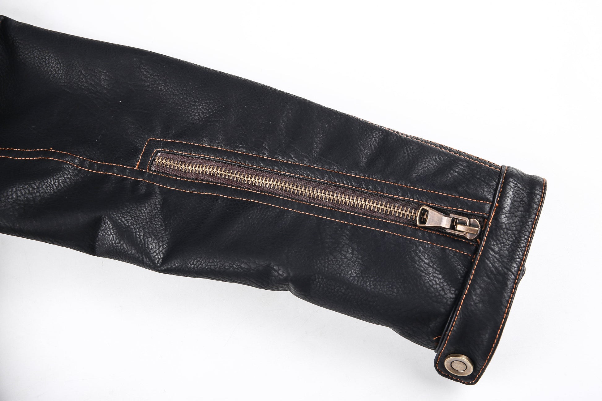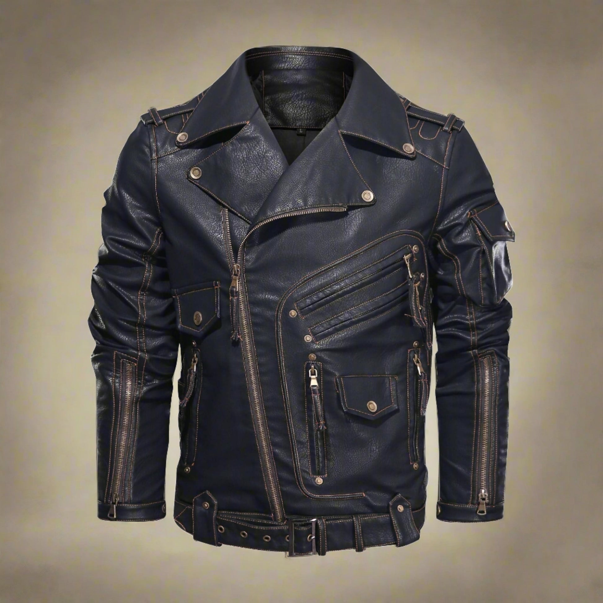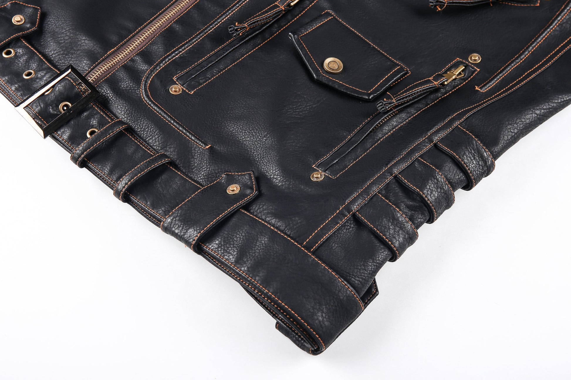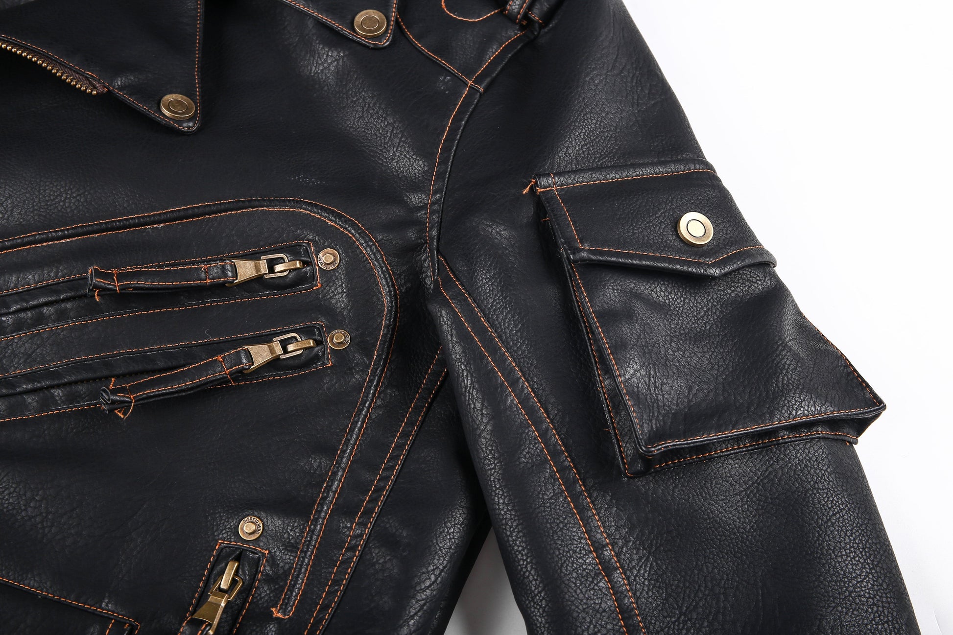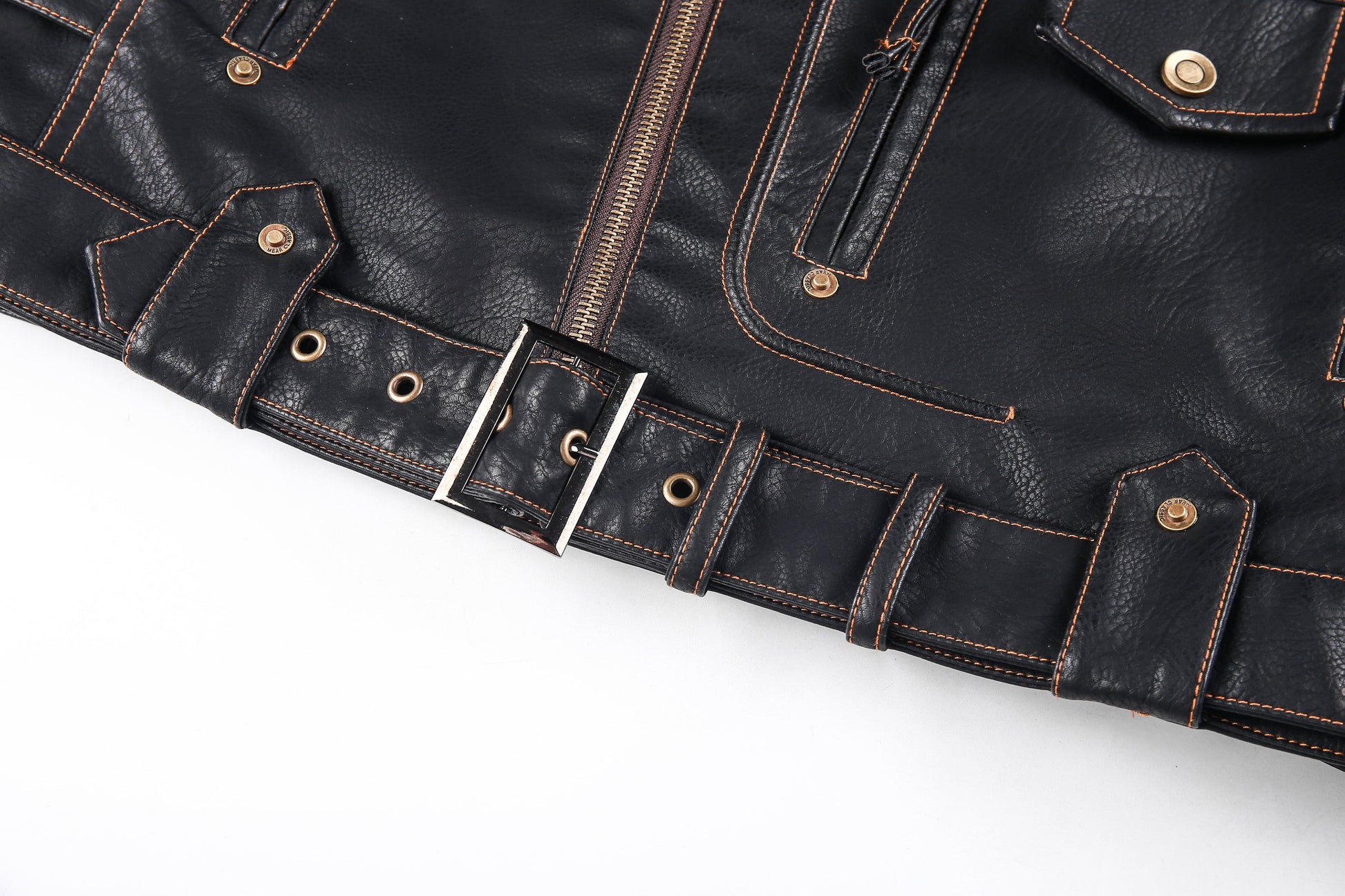 Jeder Reißverschluss, Knopf und Niet ist strategisch platziert, um das rebellische Ästhetik der Jacke zu verstärken. Ob Sie auf der Autobahn cruisen oder durch die Stadt schlendern, diese Jacke bietet die perfekte Mischung aus Komfort und Stil. Erklären Sie Ihren persönlichen Stil und umarmen Sie die rohe Energie der Straßen mit dieser ikonischen Lederjacke.