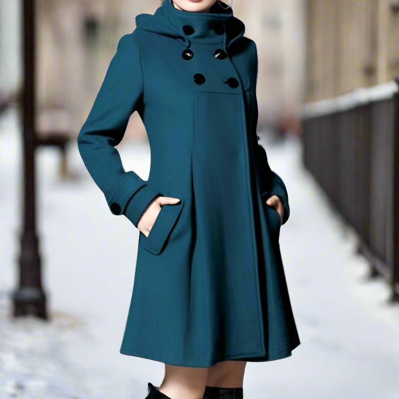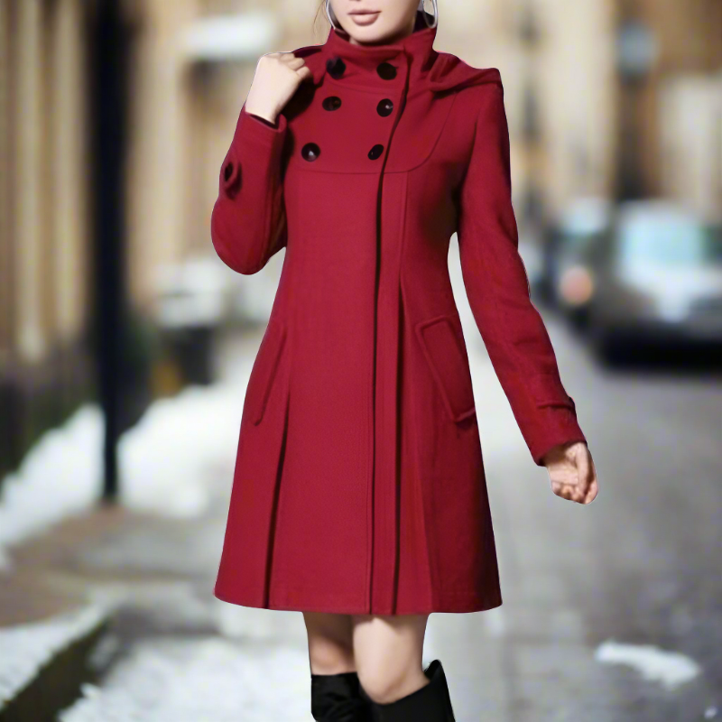 Umhüllen Sie sich diese Saison mit unserer eleganten Wollmischung. Der einzigartige Hochkragen und die doppelreihige Knopfleiste verleihen einen Hauch von Vintage-Charme und bieten zusätzlichen Schutz gegen die Kälte. Praktische Seitentaschen sind nahtlos integriert, um Ihre Essentials griffbereit zu halten.
