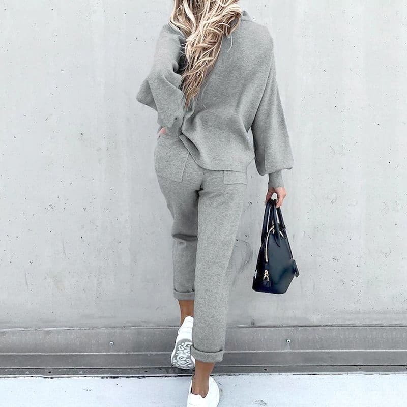 Diese Kombination ist ideal für die Tage, an denen Sie mit minimalem Aufwand gut aussehen möchten. Ob Sie Besorgungen machen oder ein entspanntes Wochenende zu Hause genießen, dieses Loungewear-Set in Kombination mit der trendigen weißen Handtasche sorgt dafür, dass Sie dies stilvoll und komfortabel tun. Accessoires wie saubere weiße Turnschuhe vervollständigen das Ensemble und machen es zum perfekten Outfit für die moderne, modebewusste Frau.