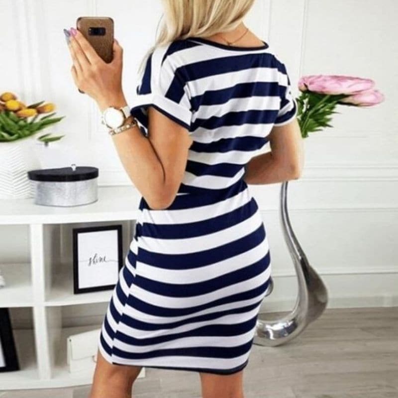 Verleihen Sie Ihrem Alltagsstil mit unserem schicken Marine-Streifenkleid mit Taillenbindung einen Hauch von Charme! Dieses mühelos bezaubernde Kleid bietet einen zeitlosen, nautischen Look, der perfekt für jede lässige Gelegenheit ist.