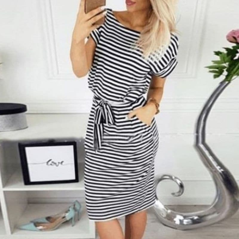 Ob Sie durch den Park schlendern, Freunde zum Brunch treffen oder einfach nur ein faules Wochenende genießen, unser schickes Marine-Streifenkleid mit Taillenbindung ist die perfekte Ergänzung zu Ihrer Garderobe. Es ist schick, es ist bequem und wartet darauf, Ihr neues Lieblingsstück für mühelosen Stil zu werden.