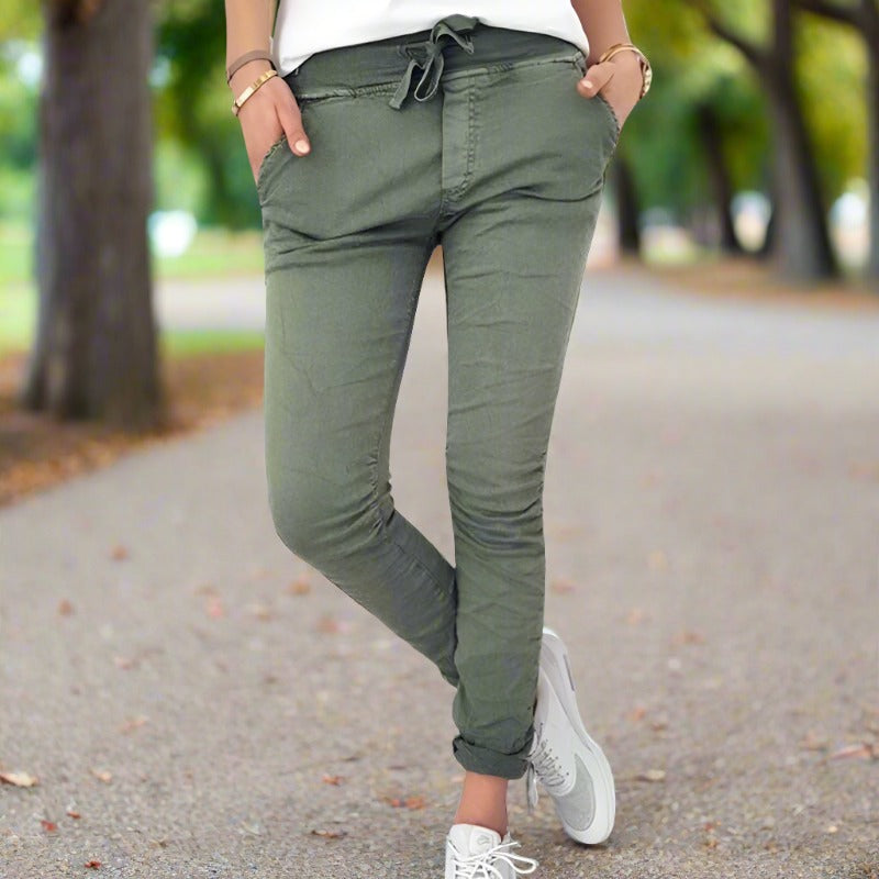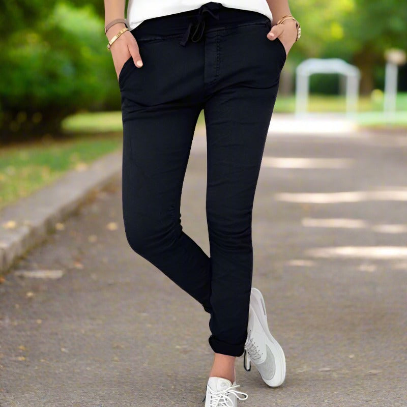 Aus weichem, dehnbarem Stoff gefertigt, bieten diese Hosen den ganzen Tag über Komfort, egal ob Sie Besorgungen machen oder zu Hause entspannen. Der elastische Bund mit Kordelzug sorgt für eine bequeme und sichere Passform, während die geräumigen Taschen ideal sind, um Ihre Essentials griffbereit zu halten.